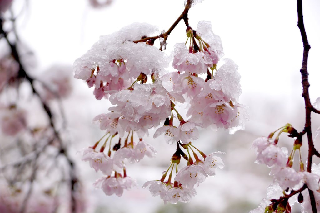柴田町船岡城址公園にて 2019年しばた桜まつり開催中★ 現在小雨に変わり雪も解け始めてはいますが、今朝6時過ぎに来た時の満開の標準木・・・重たい雪でかなりしんどそうでした。 雪の影響で園地内のあちこちで枝が折れたりしています。足元もかなり悪いので十分お気をつけ下さい。
