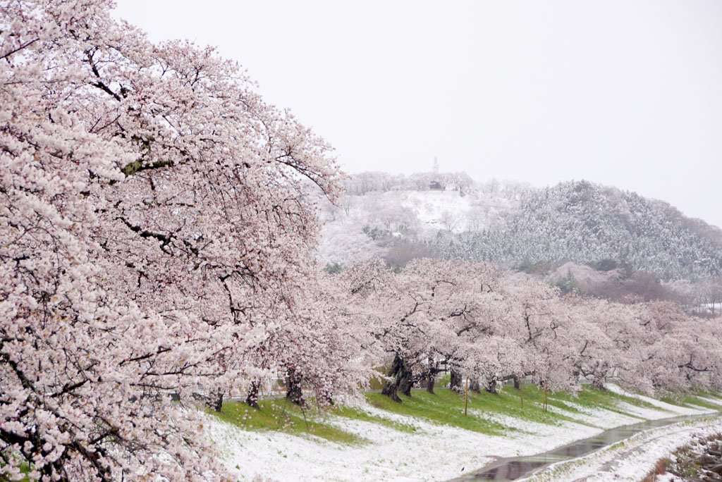 2019年しばた桜まつり開催中! 今朝6時頃の白石川堤一目千本桜・・・もう満開なんだか雪なんだか・・・。