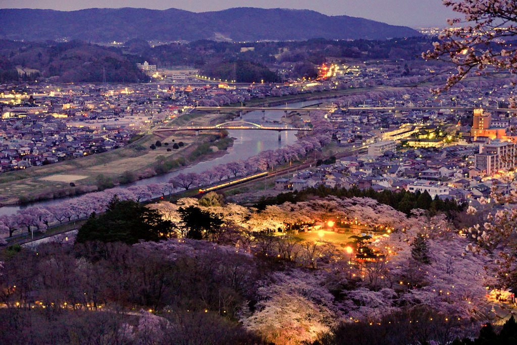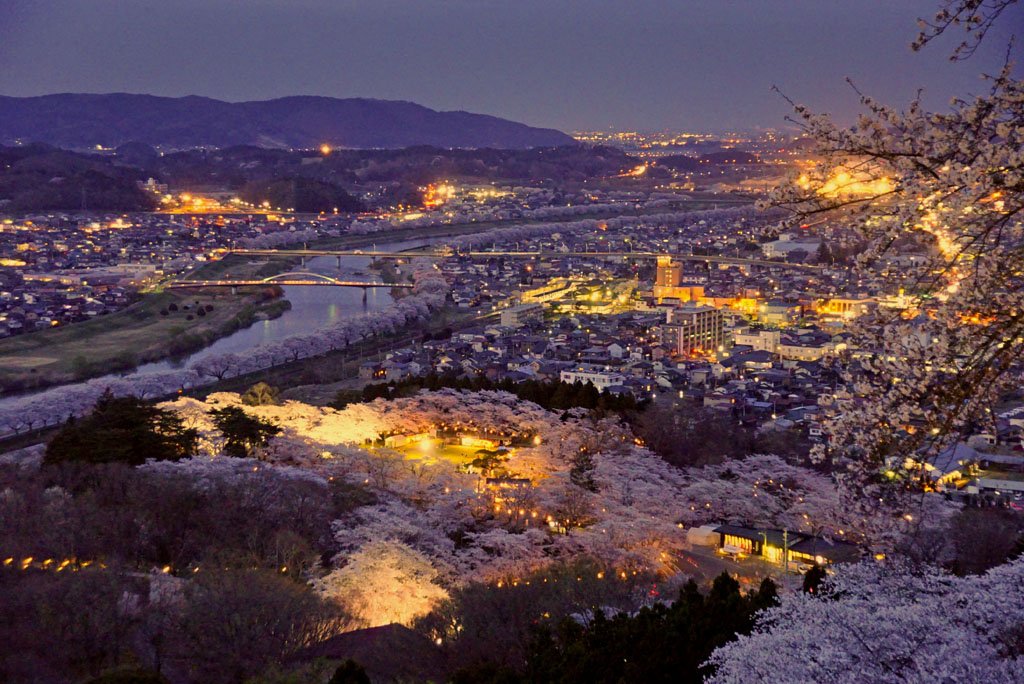 柴田町船岡城址公園にて 2018年しばた桜まつり開催中! 昨日から夜桜ライトアップ始まってます★ スロープカーは21時まで運行します。歩いて山頂へ向かう方は、遊歩道真っ暗なので懐中電灯などがあった方が安全ですよ~