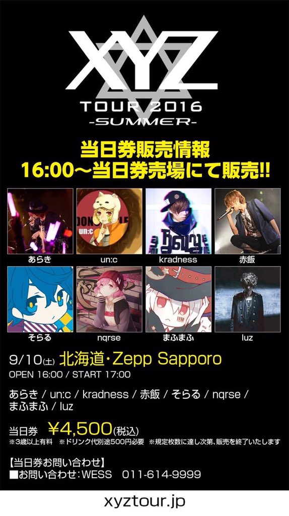 いよいよツアーファイナル!【XYZ TOUR 2016 -SUMMER- チケット情報】9/10(土)Zepp札幌 チケット好評発売中!あらき un:c kradness 赤飯 そらる nqrse まふまふ luz #XYZTOUR