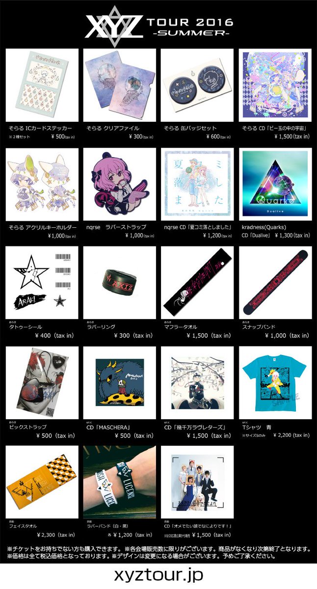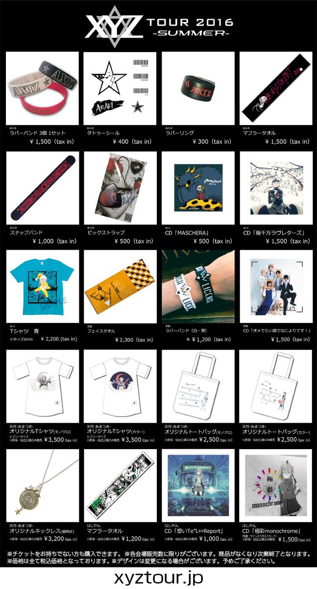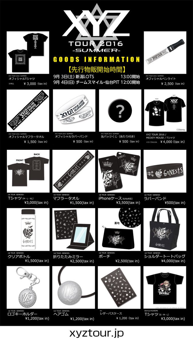 【XYZ TOUR 2016 -SUMMER- グッズ情報】今週末の新潟公演は13時、仙台公演は12時よりグッズ先行販売開始!チケットをお持ちでない方もご購入いただけます。 #XYZTOUR