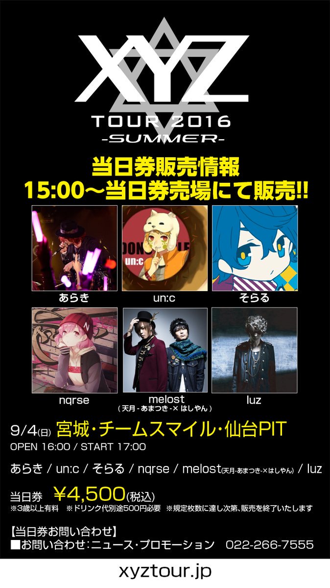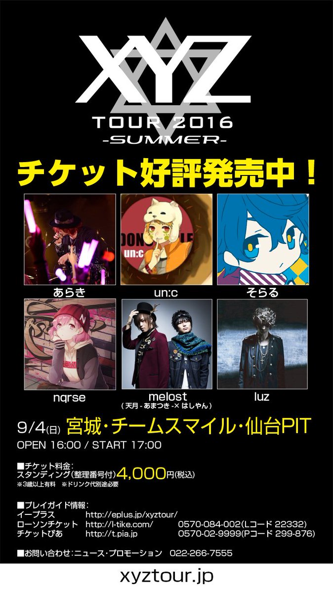 今週末開催!【XYZ TOUR 2016 -SUMMER- チケット情報②】9/4(日)仙台PIT チケット好評発売中!あらき un:c そらる nqrse melost(天月-あまつき-×はしやん) luz #XYZTOUR
