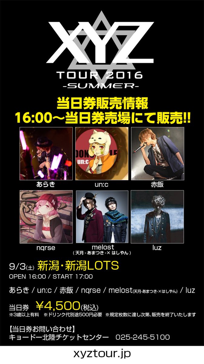 【XYZ TOUR 2016 -SUMMER- 当日券情報】9/3(土)新潟LOTS 16時~当日券販売!あらき un:c 赤飯 nqrse melost(天月-あまつき-×はしやん) luz #XYZTOUR