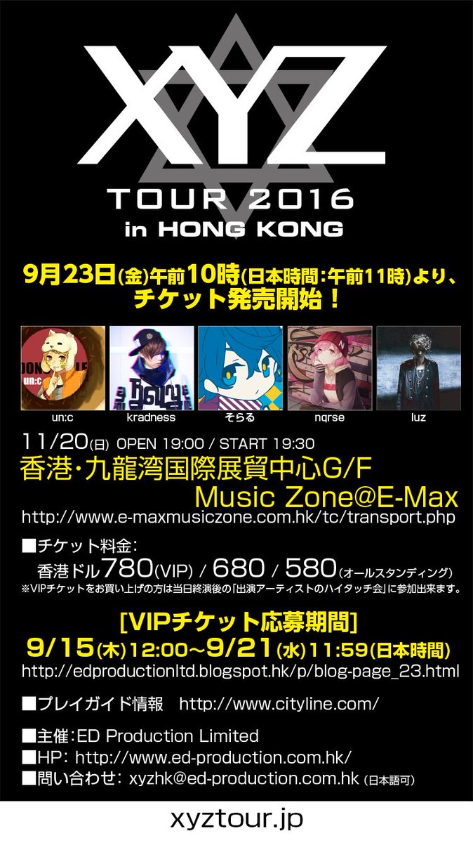 【XYZ TOUR 2016 in 香港】11/20(日)九龍湾国際展貿中心G/F Music Zone@E-Max un:c kradness そらる nqrse luz 9月23日(金)よりチケット発売開始! xyztour.jp #XYZTOUR