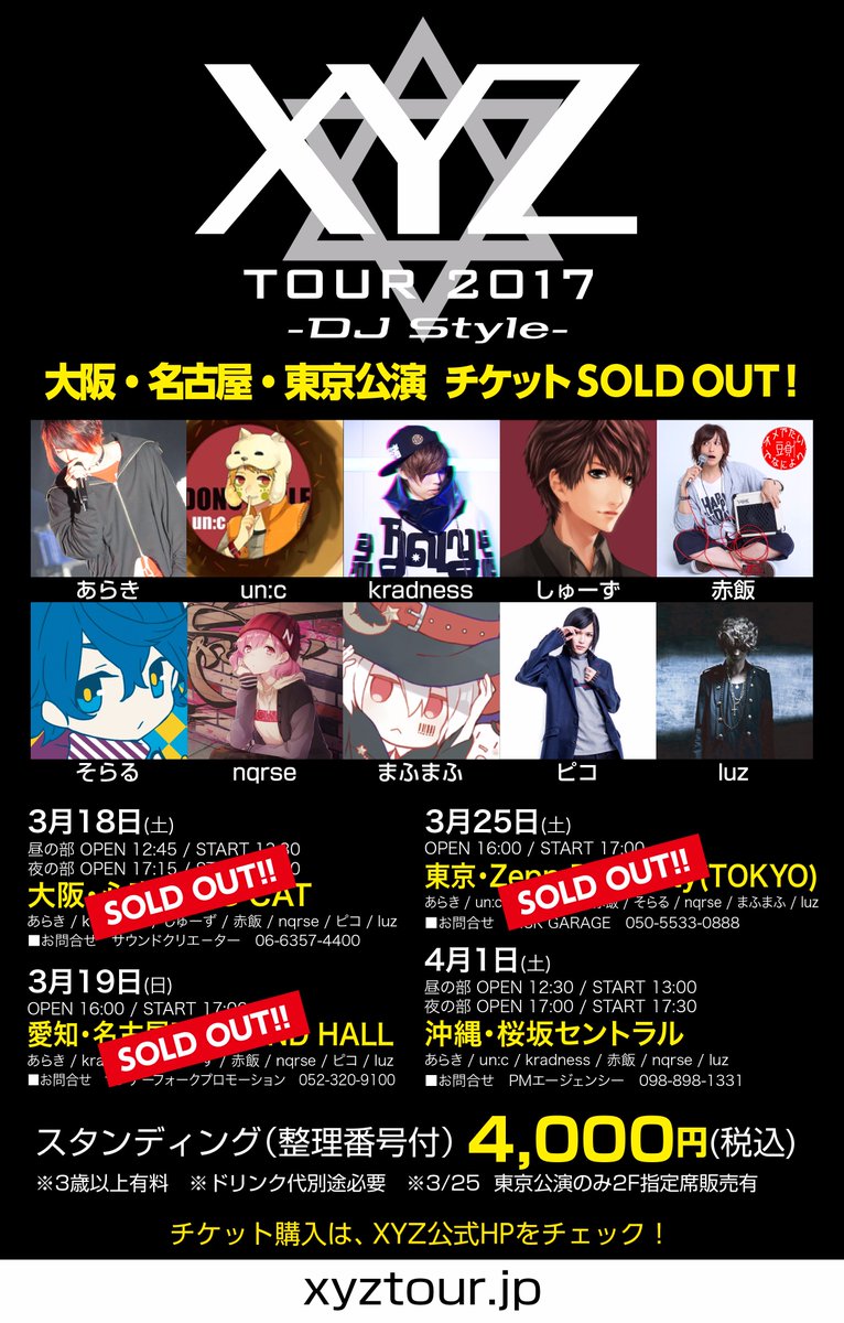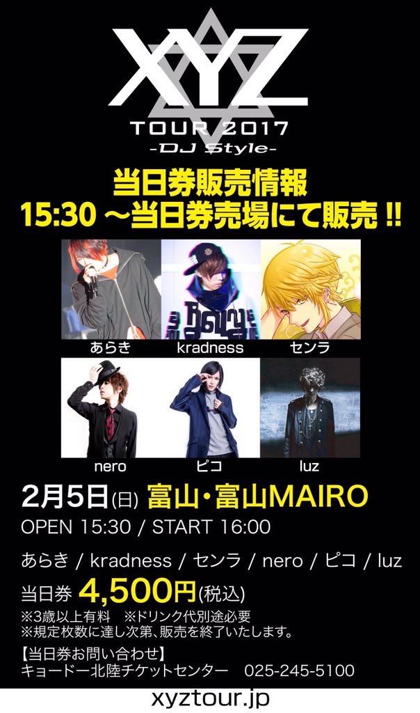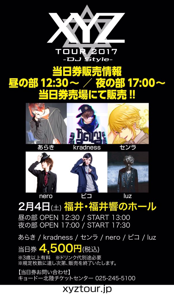 【XYZ TOUR 2017 -DJ Style- 当日券情報!】2/4(土)福井響のホール、2/5(日)富山MAIRO 当日券販売!あらき kradness センラ nero ピコ luz #XYZTOUR