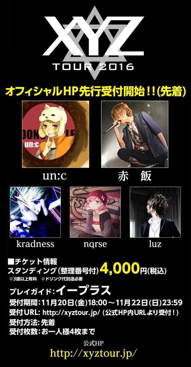先着受付!【XYZ TOUR 2016 チケット先行情報!】本日20日18時~オフィシャルHP先行受付開始!受付は22日(日) 23:59まで!公式HPより申込可能⇒ xyztour.jp #XYZTOUR