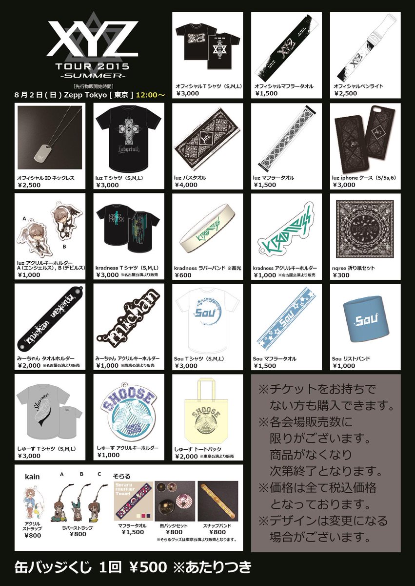 ツアー2日目!【XYZ TOUR 2015 グッズ情報】本日は東京公演!グッズの先行販売は12時開始!チケットをお持ちでない方もグッズを購入頂けます! xyztour.jp #XYZTOUR