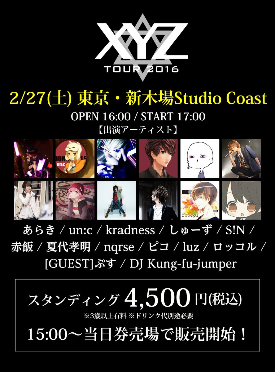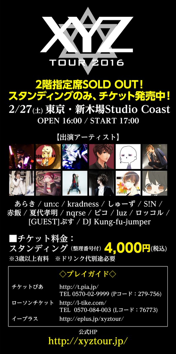 【XYZ TOUR 2016 当日券情報!】1/16(土)鹿児島キャパルボホール 16時~当日券販売!あらき un:c kradness S!N nqrse luz xyztour.jp #XYZTOUR