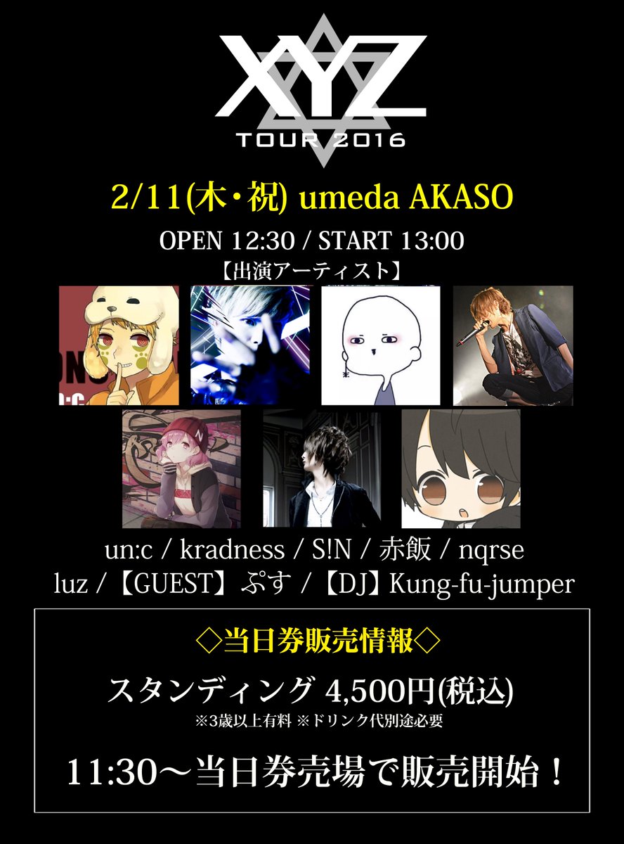 【XYZ TOUR 2016 当日券情報!】2/11(木祝)梅田AKASO 11時半~当日券販売!un:c kradness S!N 赤飯 nqrse luz ぷす xyztour.jp #XYZTOUR