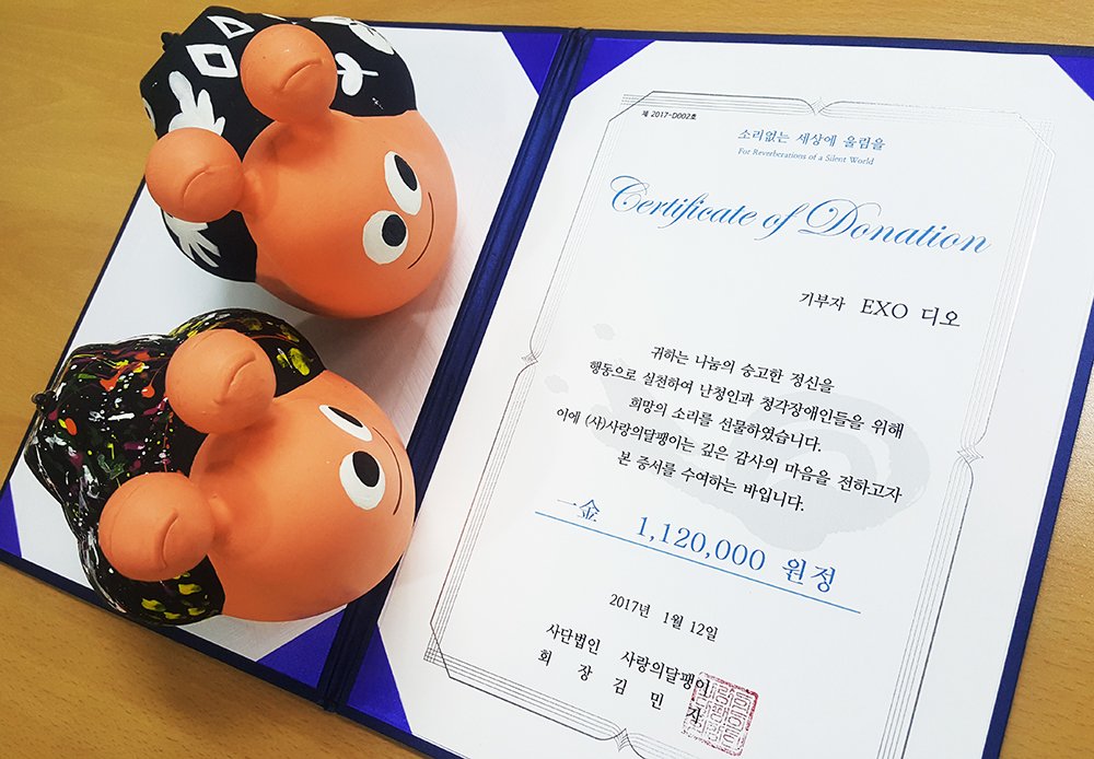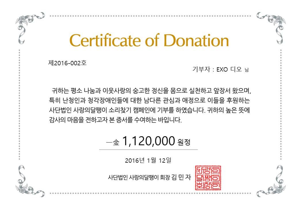 인기 그룹 엑소의 멤버 디오의 팬클럽에서 디오의 생일(1월12일)을 맞아 사랑의달팽이에 112만원 기부 해주셨습니다~감사합니다~청각장애인 아동의 언어치료에 사용하겠습니다^^디오,팬클럽 감사~!