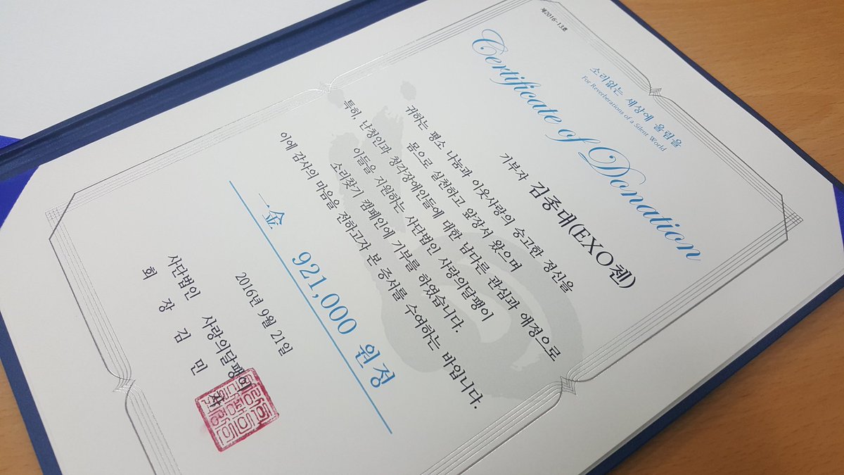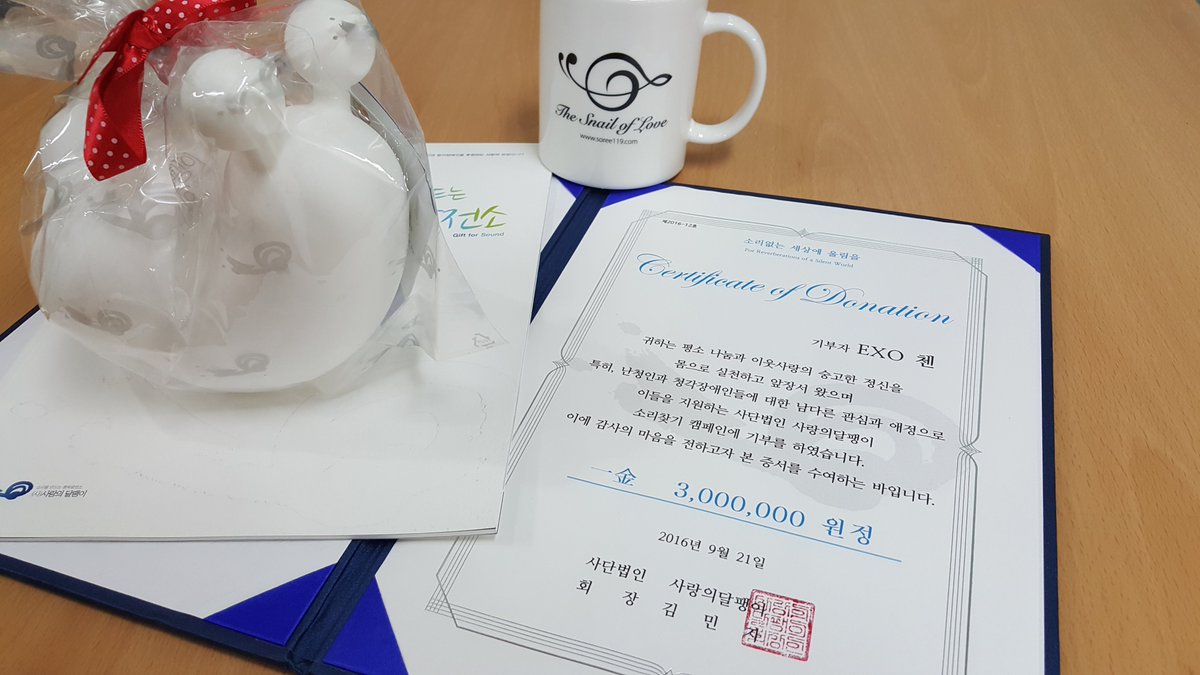오늘 #EXO #첸 팬클럽 #종대의럭키원순딩이들 에서 청각장애인을 위한 인식개선사업에 사용해달라고 기부금을 전달하였습니다.