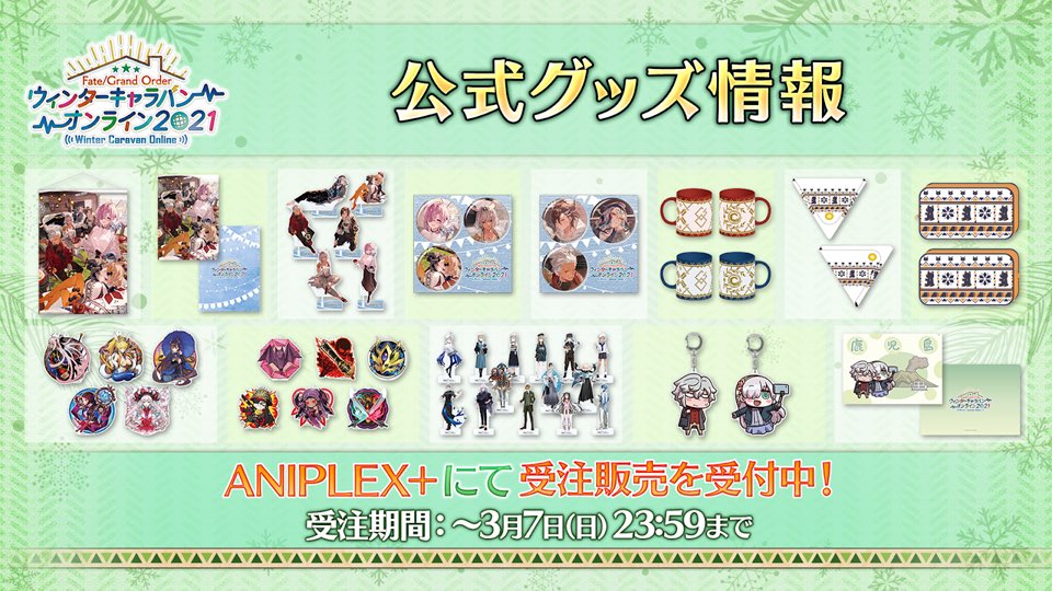 描き下ろしイベントビジュアルやリヨさん描き下ろしご当地イラスト全3種を使用した「FGO ウィンターキャラバン オンライン 2021」グッズ受注受付は、本日3月7日(日)23:59まで!ラインナップについて詳しくは→fes.fate-go.jp/winter/goods/ #FGO