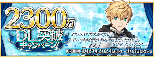 「2300万DL突破キャンペーン」の開催は、明日3月3日(水)12:59で終了となりますのでご注意ください。詳しくは→news.fate-go.jp/2021/2300man/ #FGO