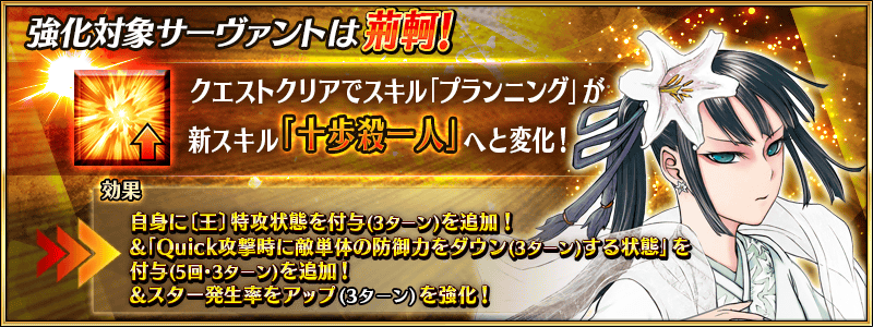 「★5(SSR)レオナルド・ダ・ヴィンチ(キャスター)」「★5(SSR)天草四郎」「★3(R)荊軻」が強化される特別なクエスト「サーヴァント強化クエスト」が、カルデアゲートに恒常的に追加されました!詳しくは→news.fate-go.jp/2021/slap_stic… #FGO