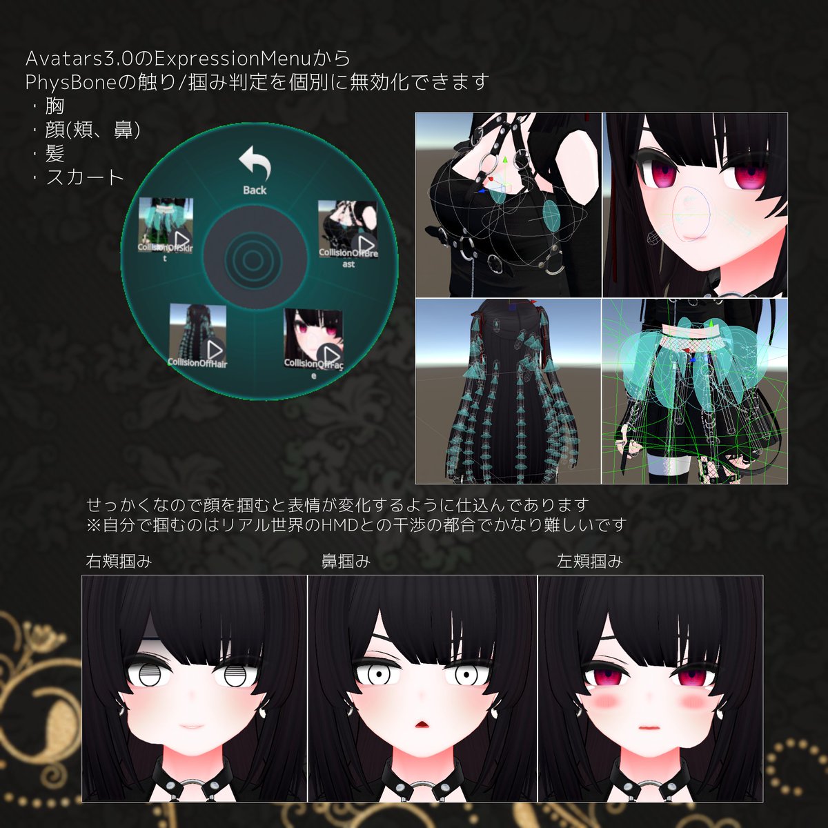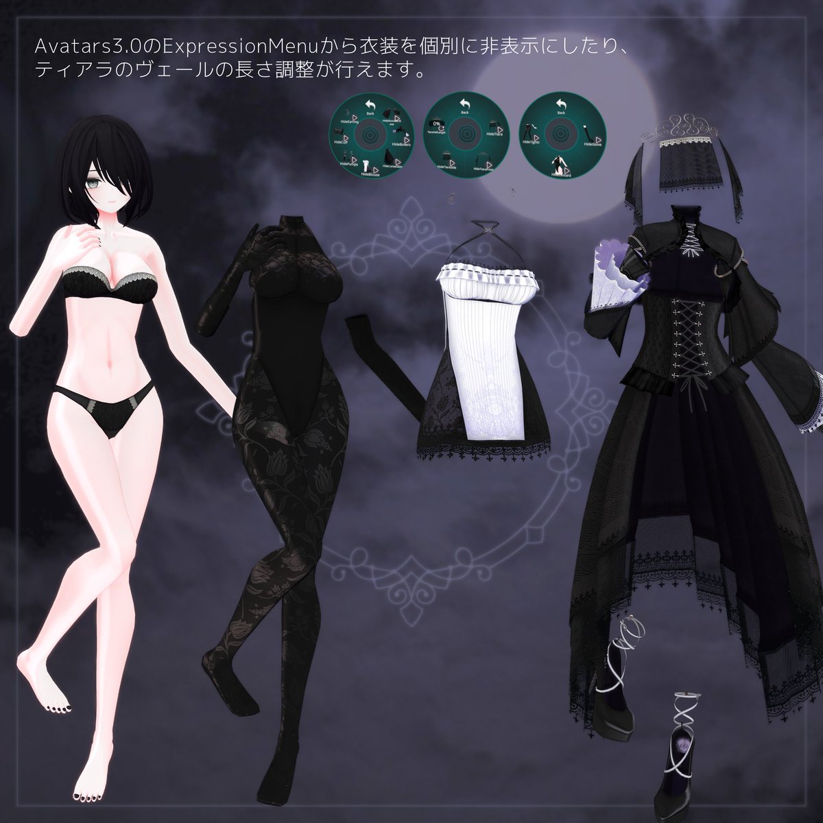 賛否ありそうな衣装パーツだらけですがExpressionMenuで個別に消せるようにしてあります。