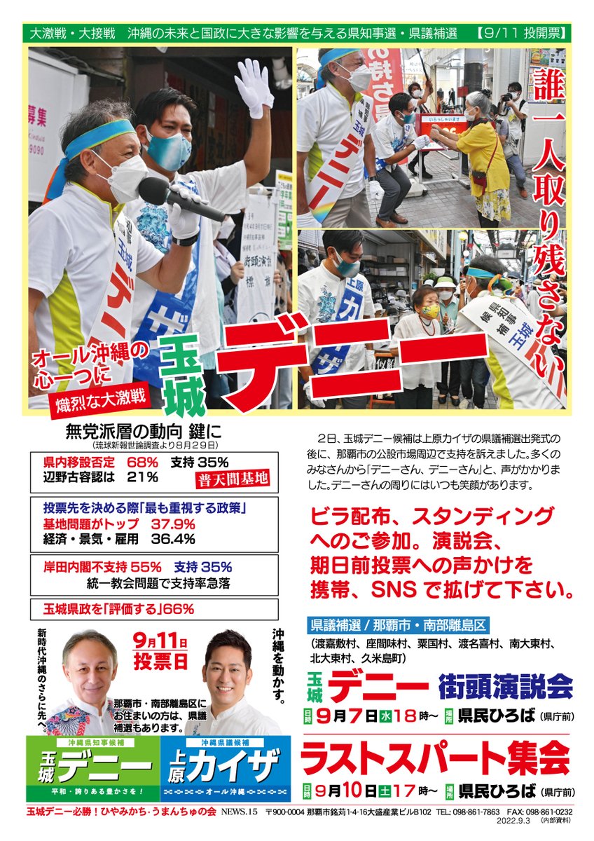 #沖縄県知事選挙 #玉城デニー を支える #沖縄県議会議員補欠選挙 候補は #上原カイザ 。与野党伯仲の沖縄県議会、デニーを支援し、県政を評価するカイザの議席は、これからのデニーの政策遂行に決定的な一議席です。那覇市・南部離島は、 #デニーとカイザ で期日前投票に行こう!