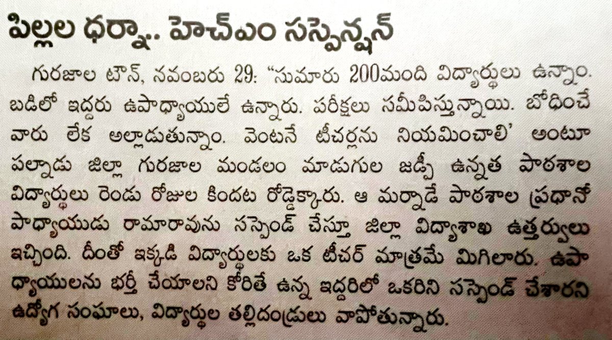 ఉపాధ్యాయులు కావాలని పిల్లలు ధర్నా చేసే స్థాయికే తీసుకురావడం సిగ్గు చేటు అంటే మళ్ళీ వారు అలా చేసినందుకు HM సస్పెన్షన్