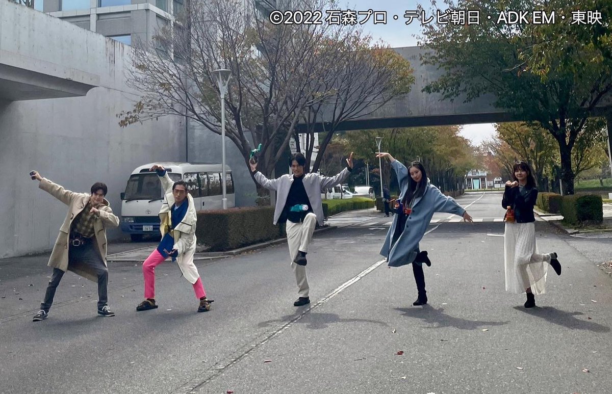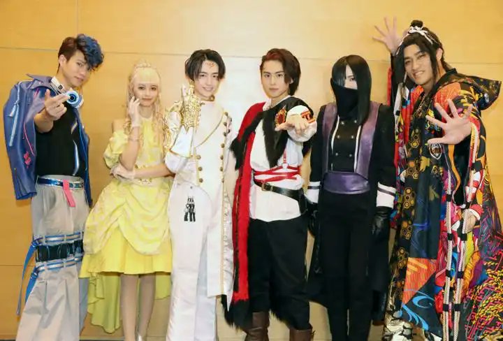 スーパー戦隊チームとしてポーズをしている仮面ライダーリバイスキャスト。