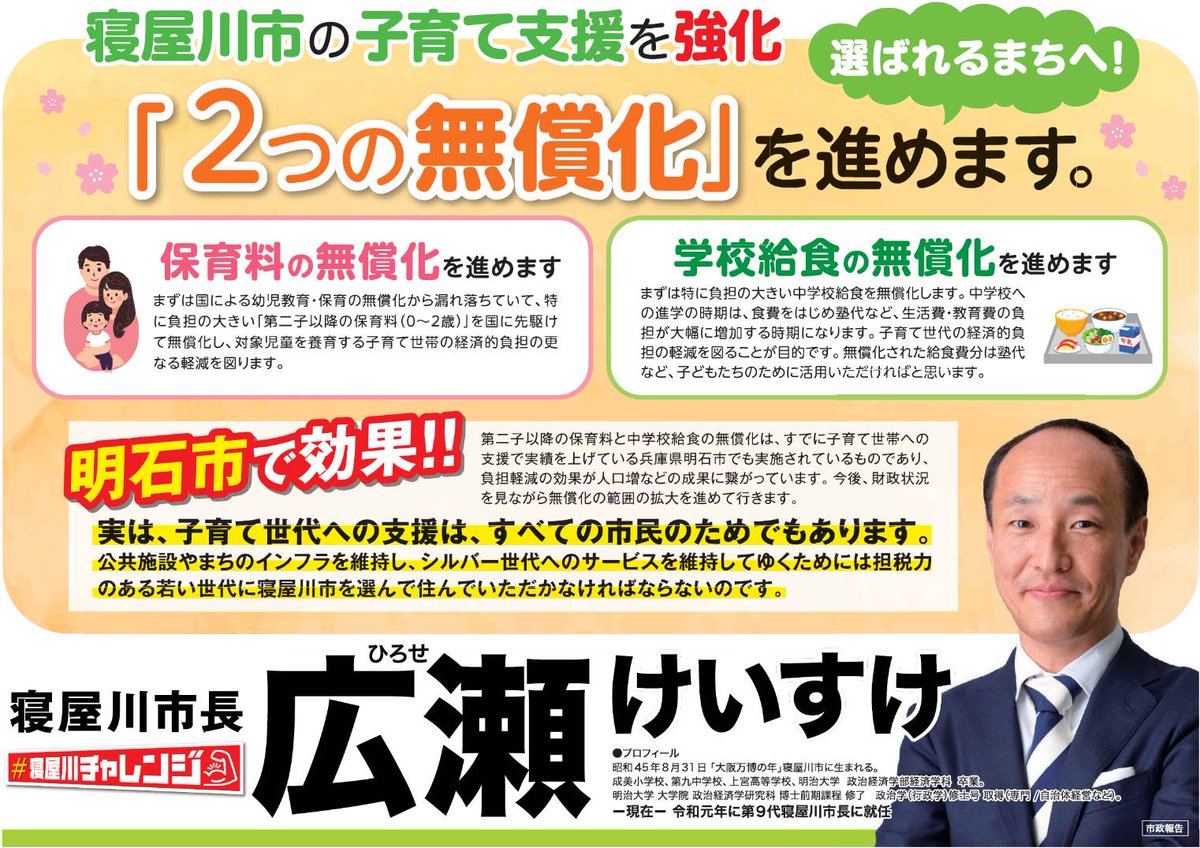 この『大きな民意』を背に、次の4年も“スピード感”を持って、寝屋川市の変革を進めて行きたいと思います。