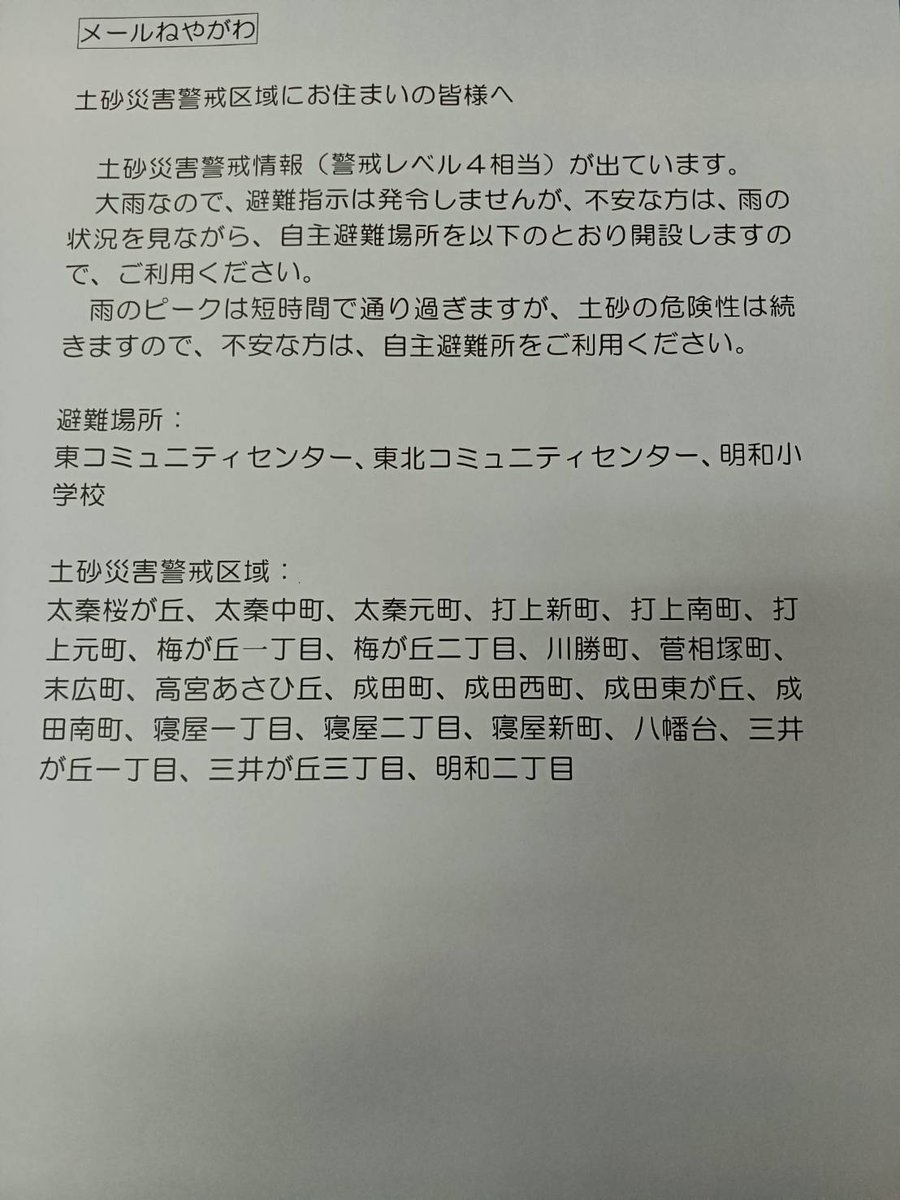 🔴現在、寝屋川市内には「大雨警報」「洪水警報」が出ています。また気象庁からは、「土砂災害危険地域」への「警戒レベル4」(※相当)が発表されており、これは市長が「避難指示」を出すレベルに相当します。… twitter.com/i/web/status/1…