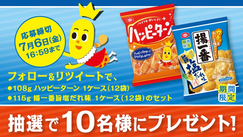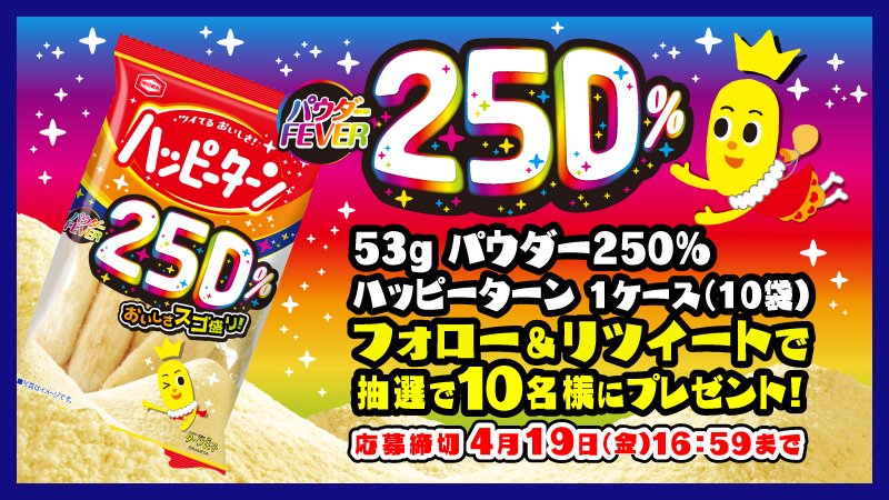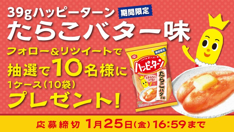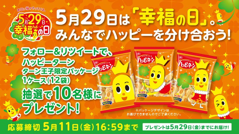 フォロー& RT で応募完了☆ 抽選で 10 名様に、ターン王子限定パッケージのハッピーターン 1 ケースが当たるよ♪