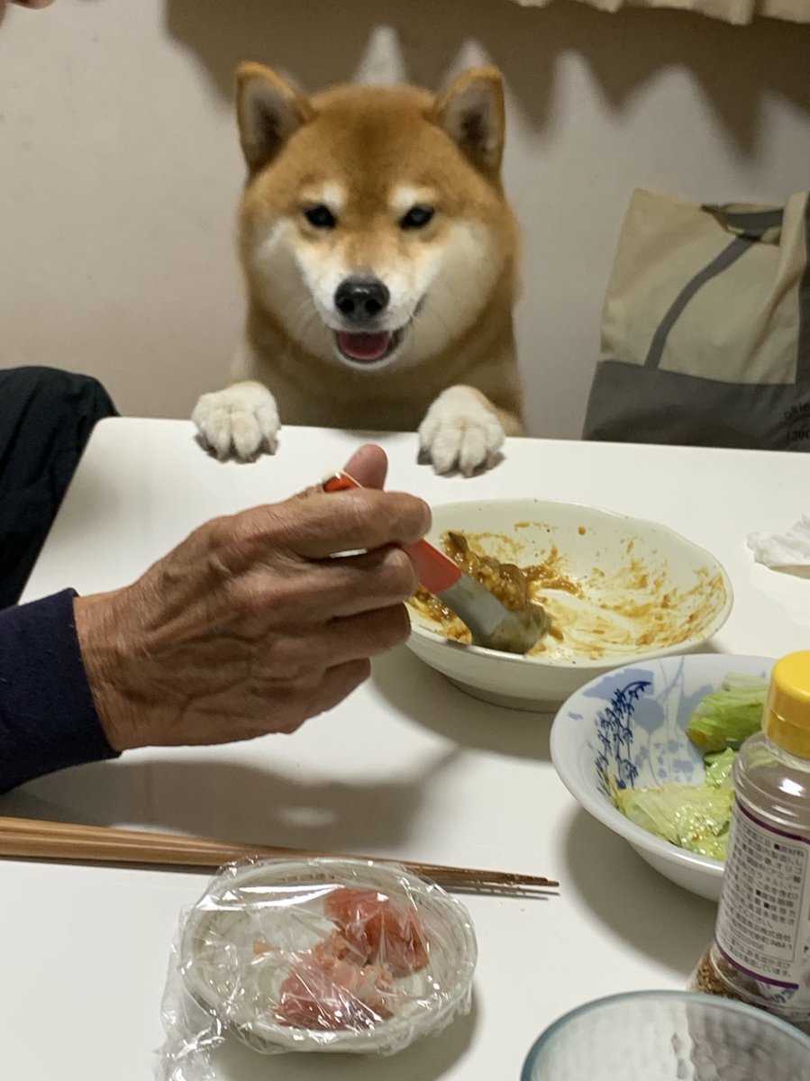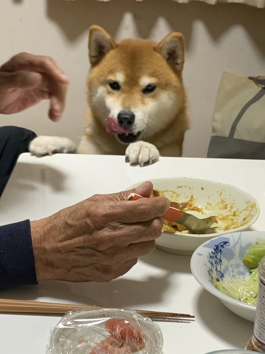 カレーライスが気になる犬 煮込む前の肉を焼いて君のご飯にもあげていますが…