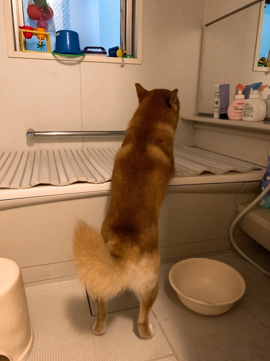 突然の雷に怯えてお風呂場に避難する犬