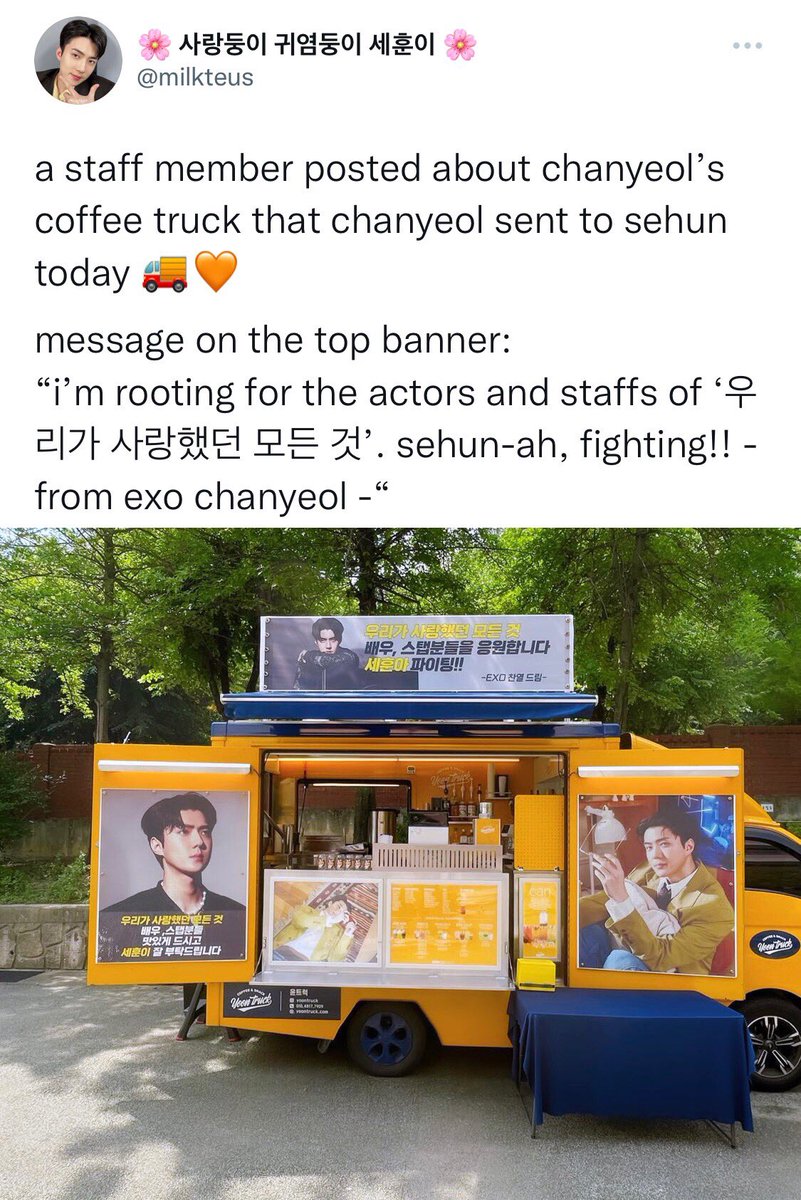 a staff member posted about chanyeol’s coffee truck that chanyeol sent to sehun today 🚚🧡