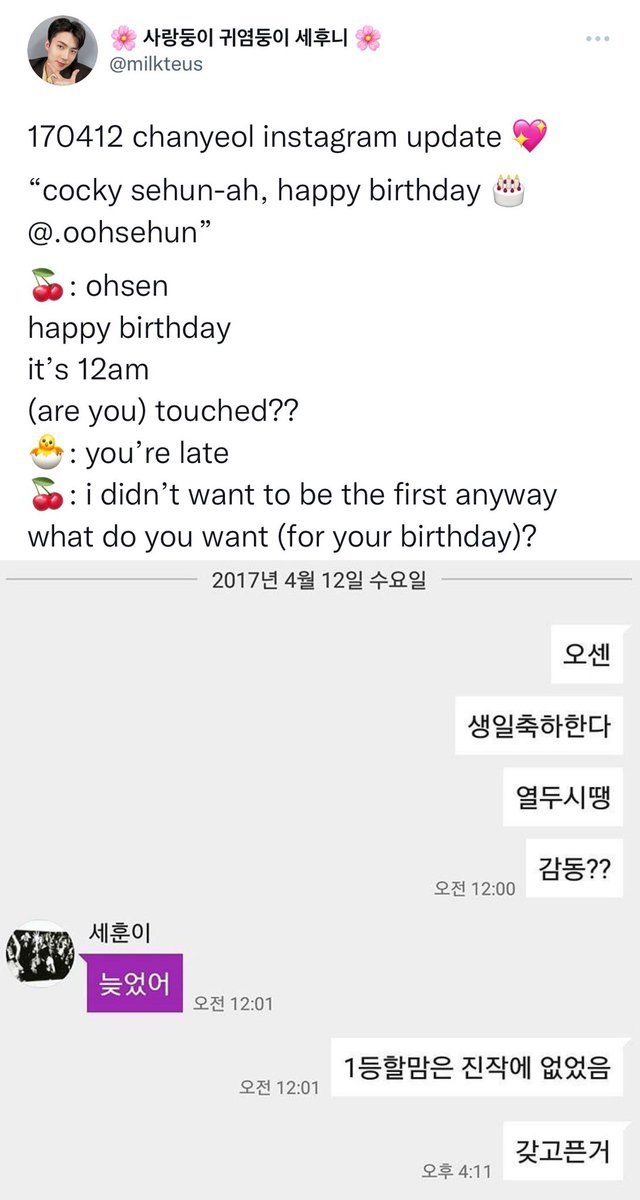 everyone knows how sehun holds grudges against his hyungs even if they are only minutes late on wishing him a happy birthday ㅋㅋㅋ twitter.com/milkteus/statu…