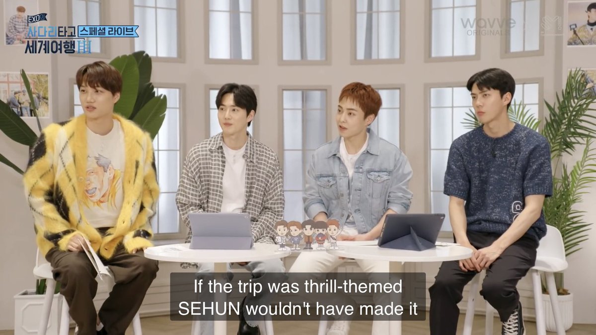 jongin: *reads fan’s comment* if the trip was thrill-themed, sehun wouldn’t have made it~