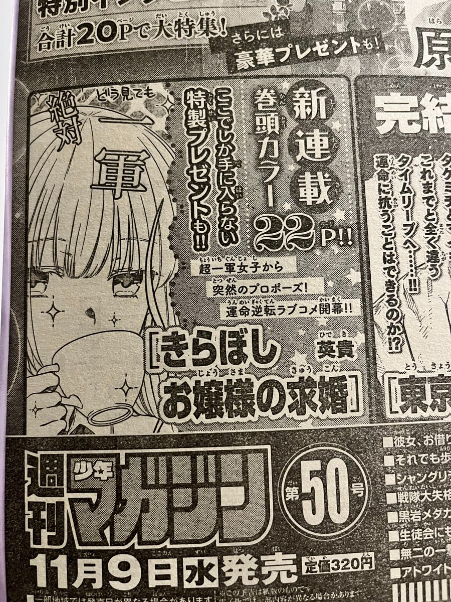 週刊少年マガジン発売です!「きらぼしお嬢様の求婚」第一話巻頭カラーにて掲載して頂いております!