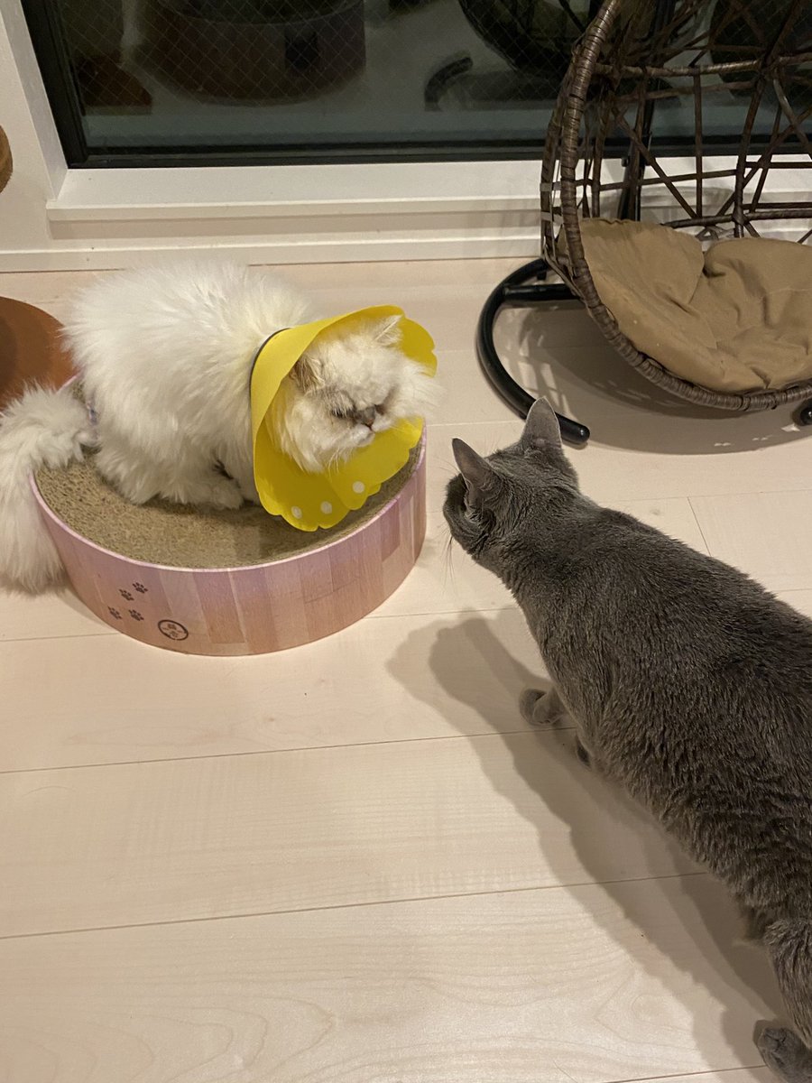 今日病院で買った新しいエリカラ(黄色)、エカちゃんがあんた誰…ってビビってました😂 ココさんのおめめは順調に治ってるって言われました✨
