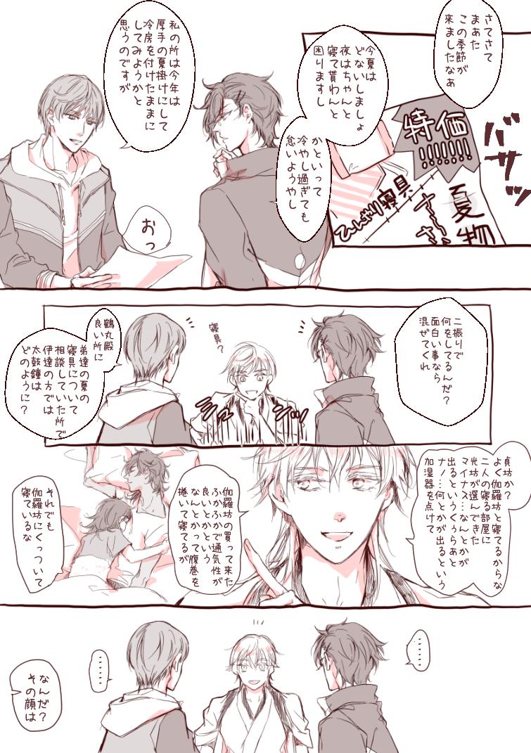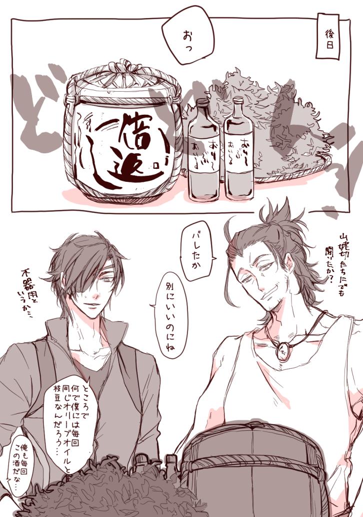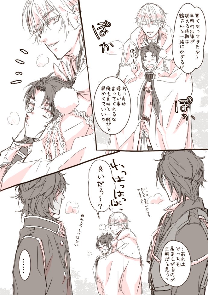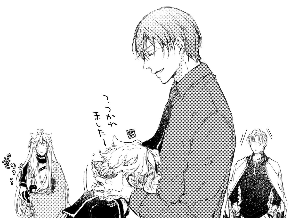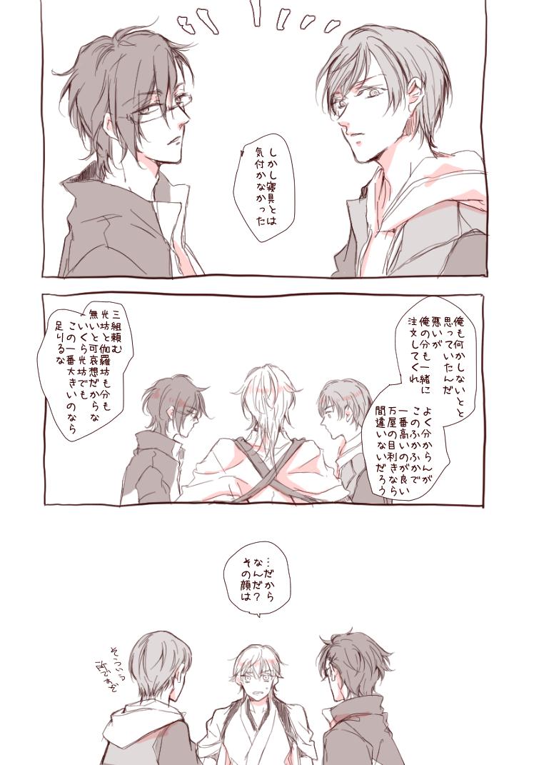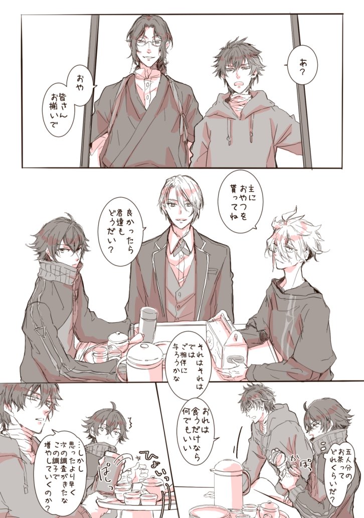 監査官殿と先行調査員殿がお茶してるだけ いつものらくがき漫画ですが、何の気なしに水心子と清麿の内番服描いてしまったのでべッターに~😌