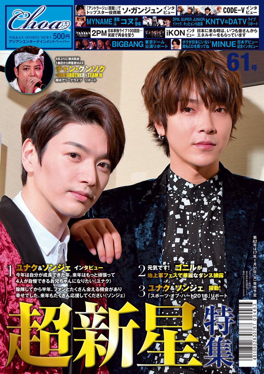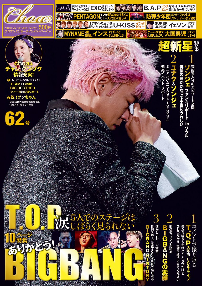 ◆投稿募集中 1月31日発売の62号で「完全保存版!BIGBANGの軌跡」と題して大きな節目を迎えたグループの歩みを特集します。投稿欄に皆さんとグループの個人的な思い出、10年の足跡について思うことなど自由意見をお寄せ下さい。nikkansports.com/entertainment/…
