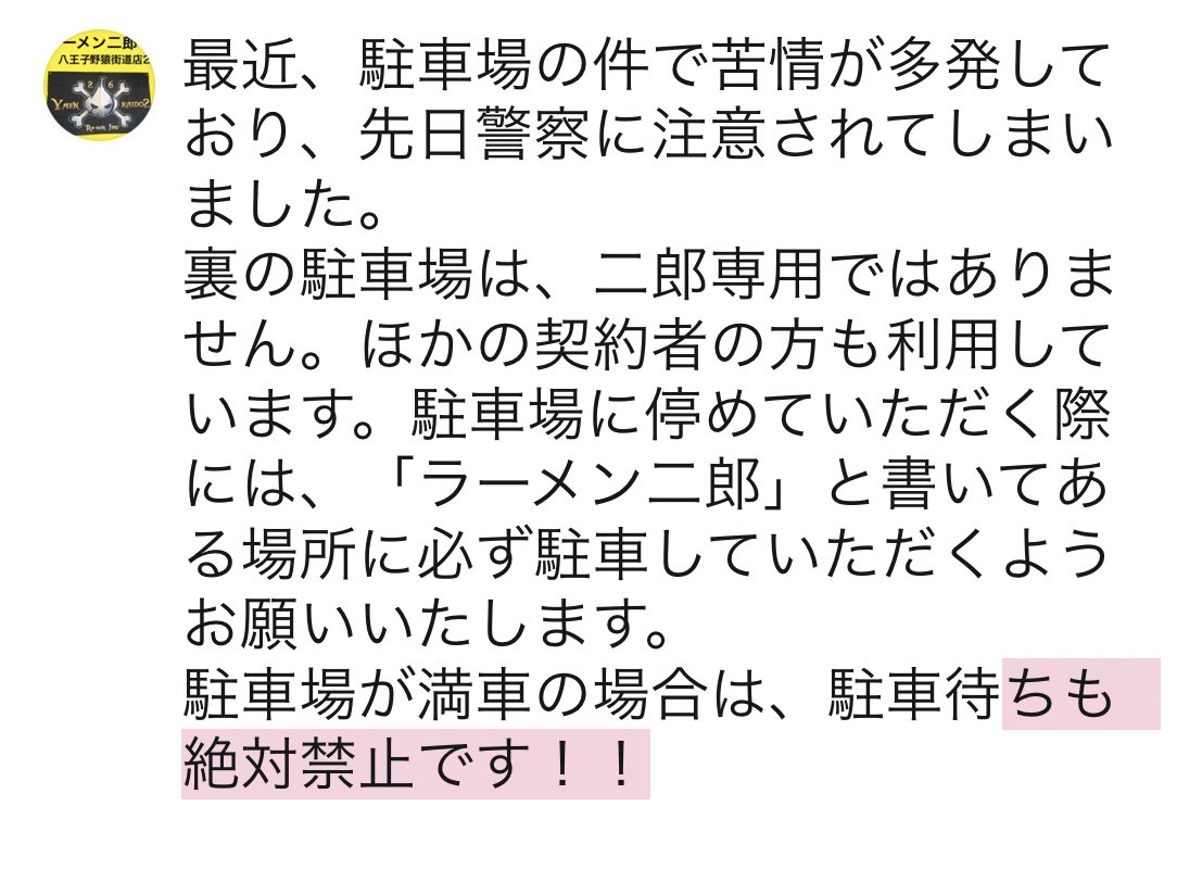 本日、近隣の店舗の駐車場に駐車される極めて悪質な駐車違反があった為、ただいまをもちまして営業を終了させていただきます。