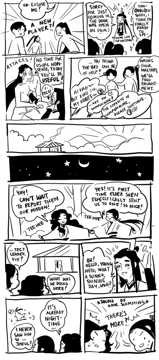 Sj isolated in a corner with a teacup in hand, while the other peak lords party and socialize: ...they dont know i go to brothel for group therapy