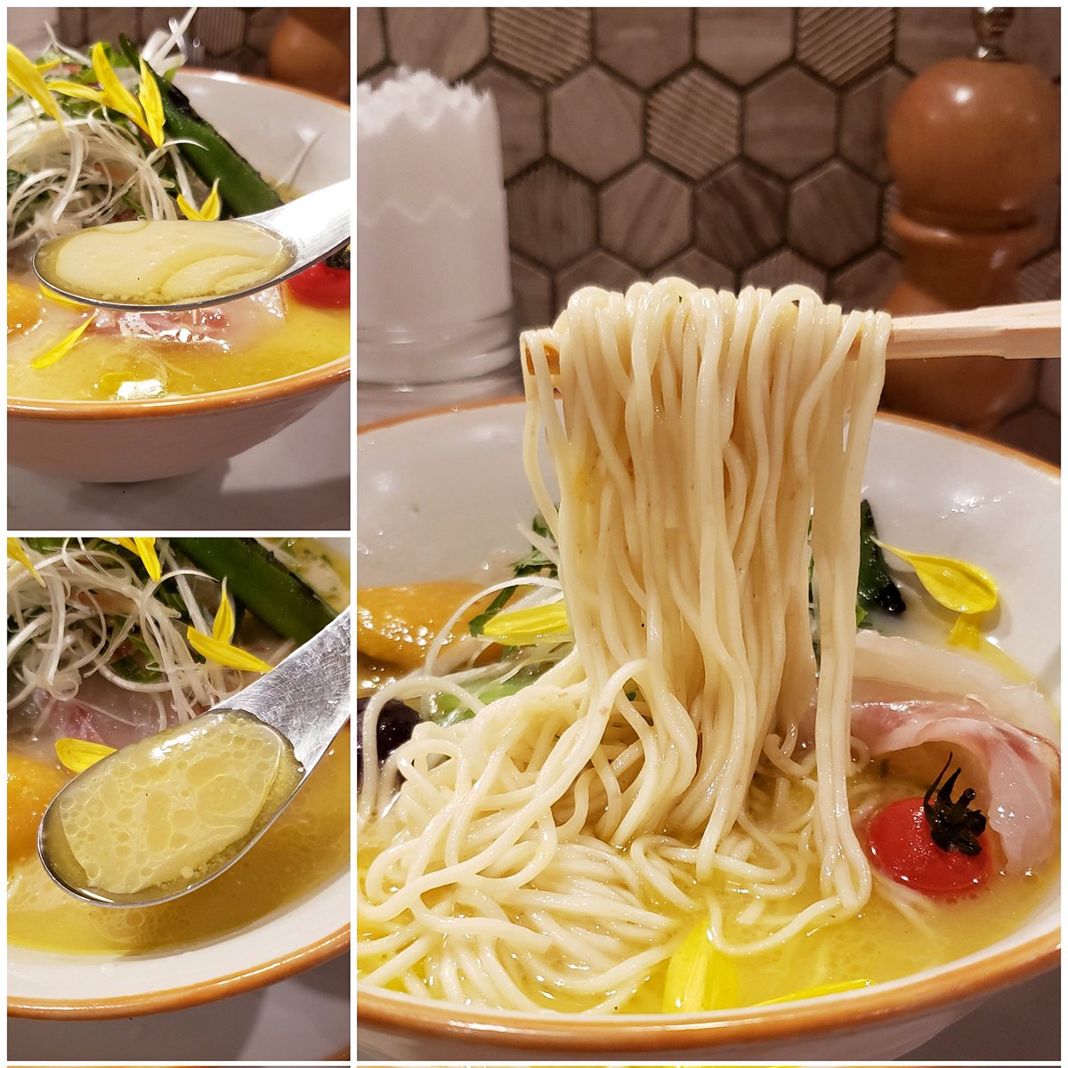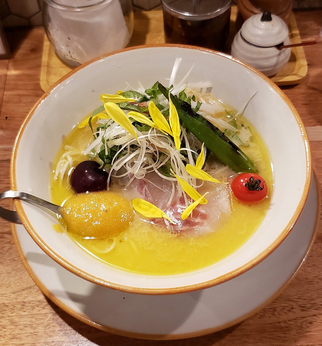 【海老丸らーめん】神保町 限定 冷やし真鯛の白湯らーめん 最高級南高梅の梅味噌添え 訪麺🍜華やかな盛付けにうっとりする冷製soup!贅沢な鯛onlyの濃密クリーミーな旨味…洋が複雑に絡み合う清涼でコク深い味わいに梅味噌の味変で整う余韻が堪らない珠玉の逸杯♪めッちゃウマ──ッ! 超絶美味‼️🙏💥💯