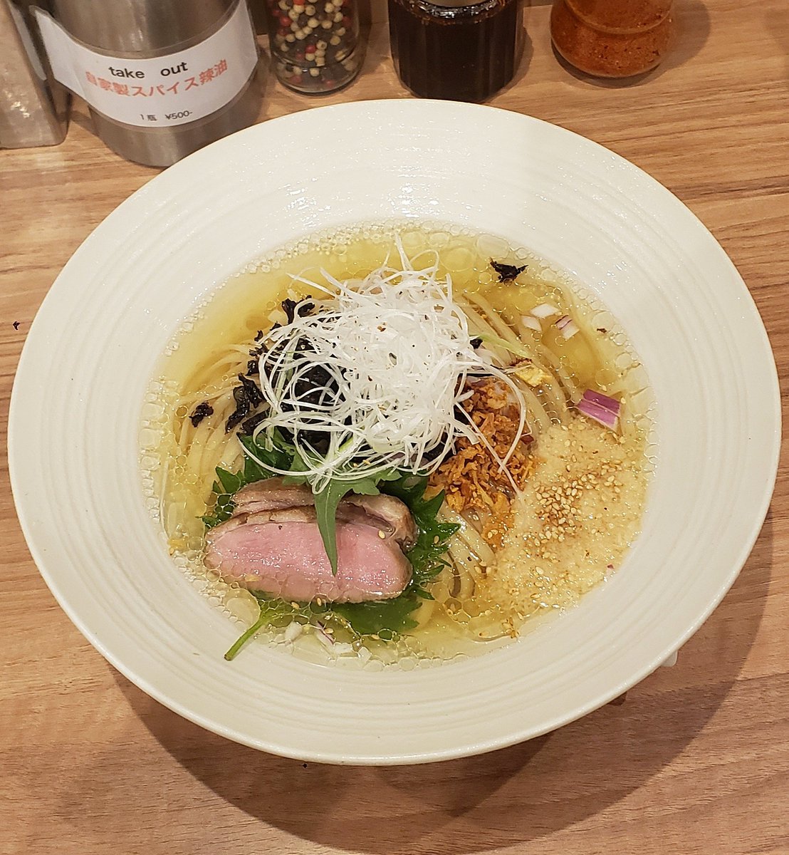【麺処 ほん田】秋葉原本店 限定 昆布と魚出汁の冷やし 塩 訪麺🍜透明感の高い冷製の煮干soup!多層に重ねた繊細な魚介出汁…美しく力強い塩味に鼻腔を突き抜けるbitterな旨味と余韻が果てしなく持続する珠玉の逸杯♪めッちゃウマ──ッ!! とろろ絡まるモッチリ平打ち麺&鴨🥩も格別🤩 超絶美味‼️🙏💥💯