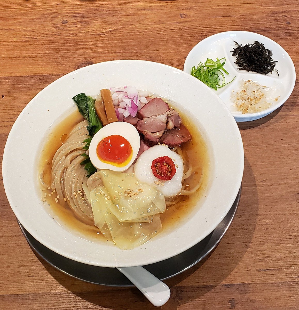 【麺や 穂ころび】本郷三丁目 味玉中華そば+肉&海老ワンタン1個ずつ 訪麺🍜端正な盛り付けで魅了する清湯soup!節の香り立つ芳醇な魚介の旨味…繊細清らかな和出汁の優しくコク深い味わいに恍惚とする珠玉の逸杯♪めッちゃウマ──ッ! 靭やかなツルパツの中細麺&格式高い雲呑も絶品🤩 超絶美味❗🙏💥💯