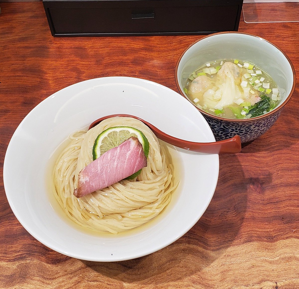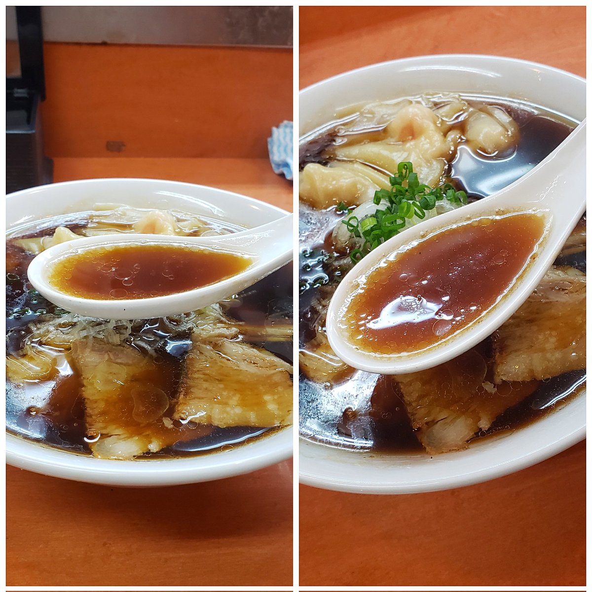 【ラーメン 日陰】江川町(新川崎) 海老ワンタンメン+濃口 訪麺🍜色濃くも穏やかな清湯soup!芳醇でスッキリな鶏出汁に爽やかな煮干の香り…繊細な素材が重なり嫋やかで奥深い味わいを演出する珠玉の逸杯♪めッちゃウマ──ッ! 独創的なフワホフ純手打ち麺&チュルプリな🦐雲呑も格別🥰 超絶美味‼️🙏💥💯
