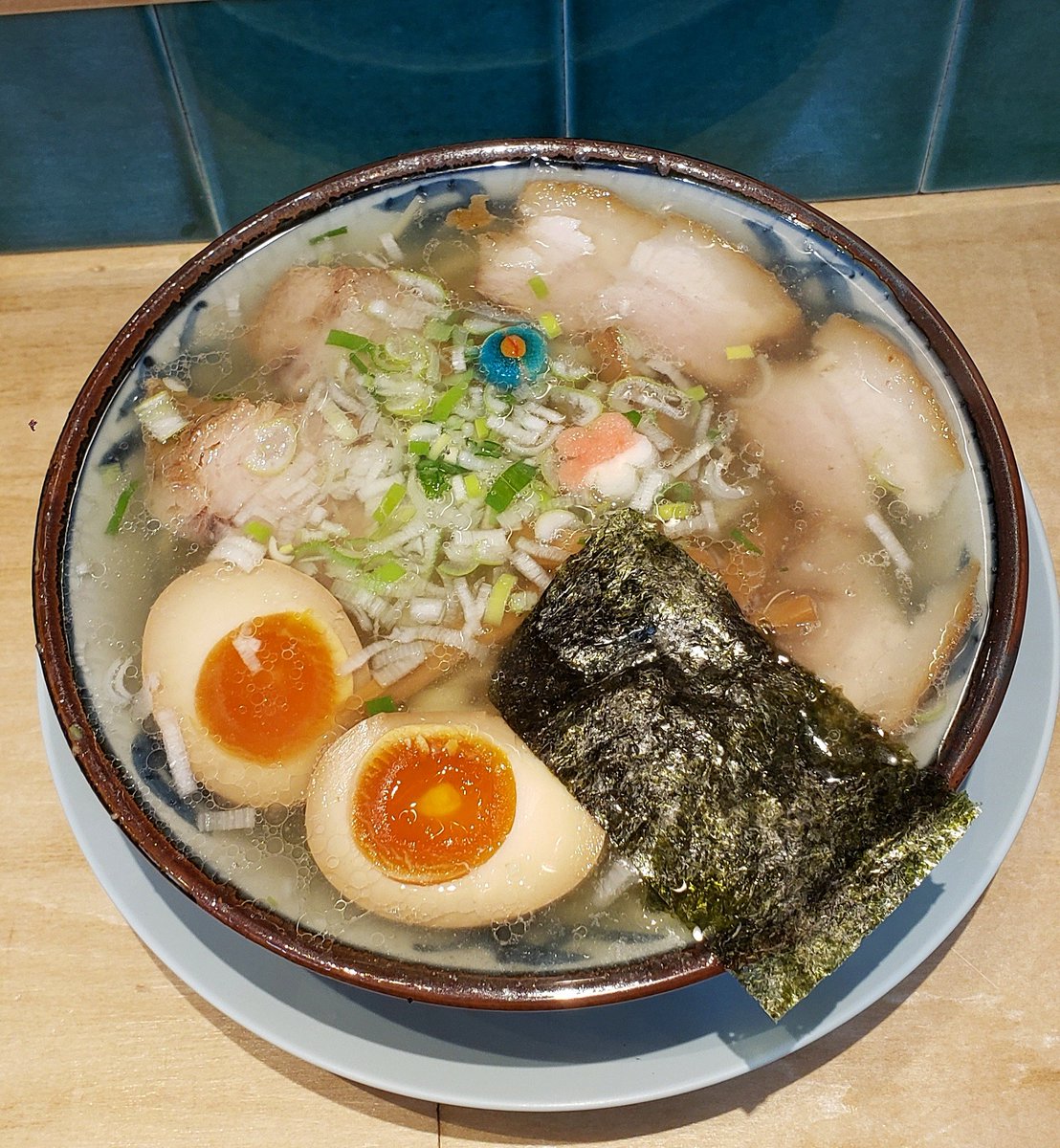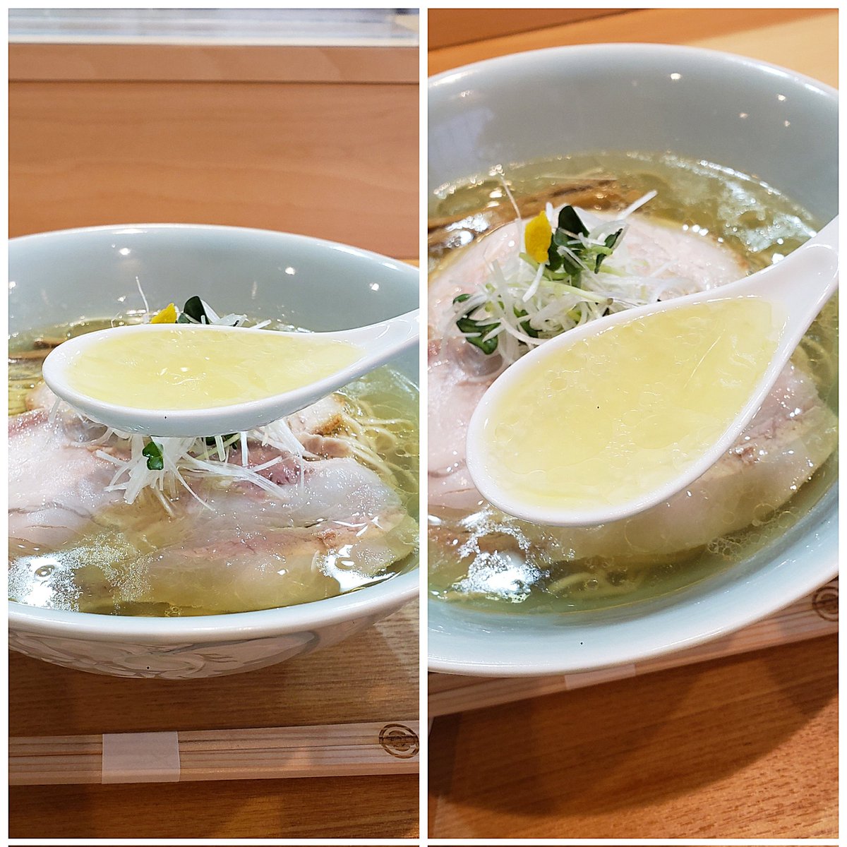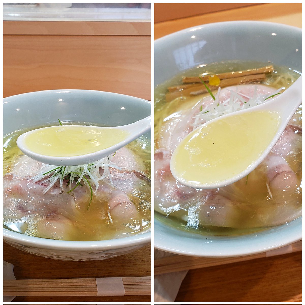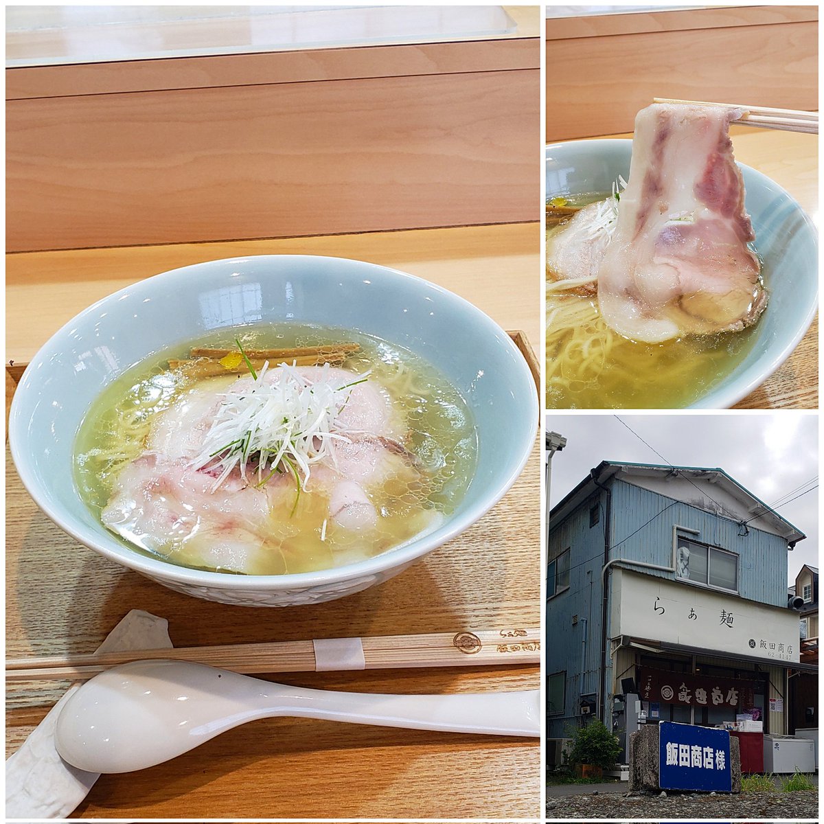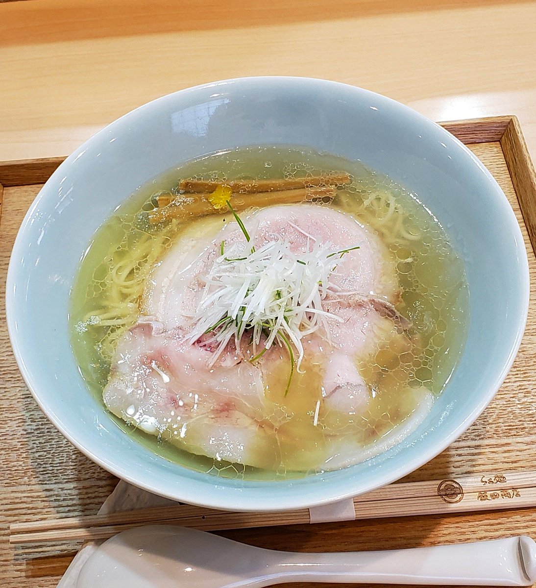 【らぁ麺 飯田商店】湯河原 しおらぁ麺 訪麺🍜端正で落ち着きのある淡麗soup!琥珀色の鶏油たっぷりな旨味に優しく穏やかな塩味…豊潤で清らかな出汁を葱の香味で引き締めはんなりな味わいをもたらす珠玉の逸杯♪めッちゃウマ──ッ!! 優美なツルモチ中細麺&天城黒豚の甘味が超好み🥰 超絶美味‼️🙏💥💯
