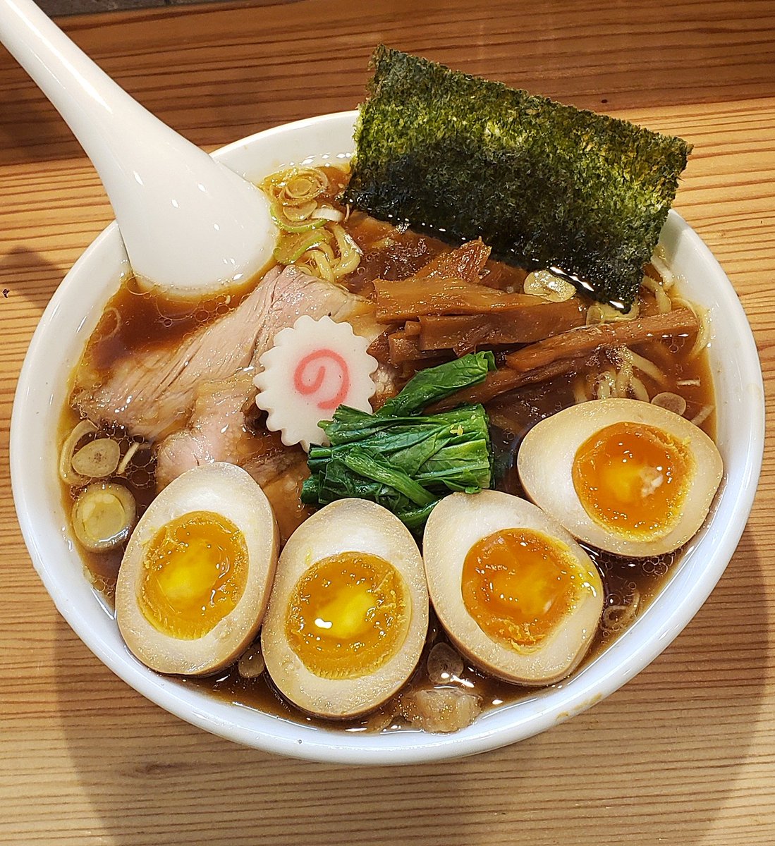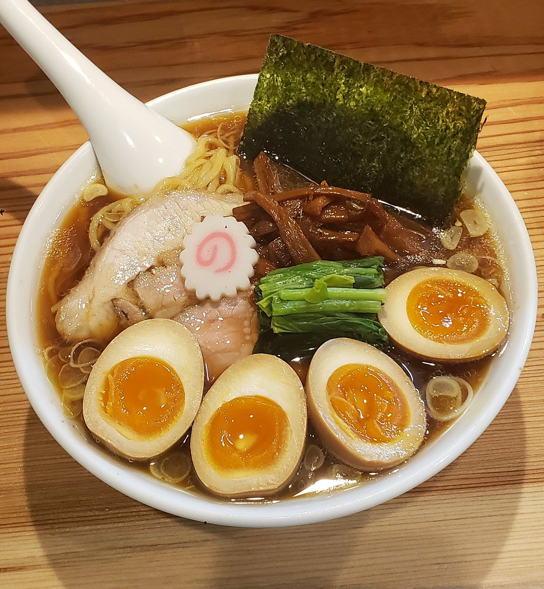 【はるちゃんラーメン】新橋 中華そば+はるたま 訪麺🍜艶やかなお麩が泳ぐ清湯soup!分厚くはんなりな豚出汁を清楚に引き締める煮干の芳香…仄かに優しい苦味と余韻が求める躰にじんわり沁みる珠玉の逸杯♪めッちゃウマ──ッ! 滲む煮豚やメンマ…チュルピロの自家製麺…全てが完璧🥰 超絶美味‼️🙏💥💯