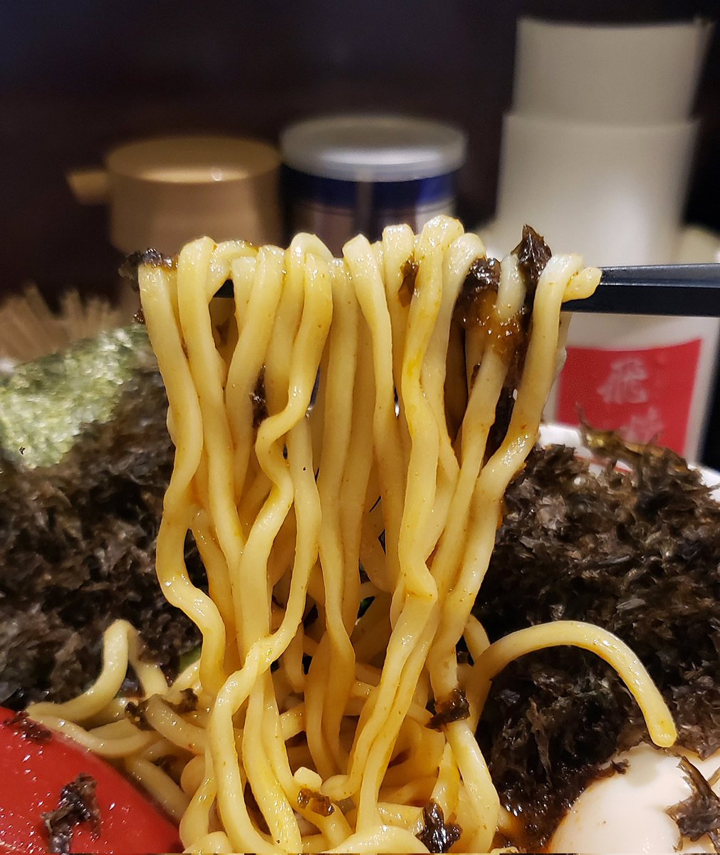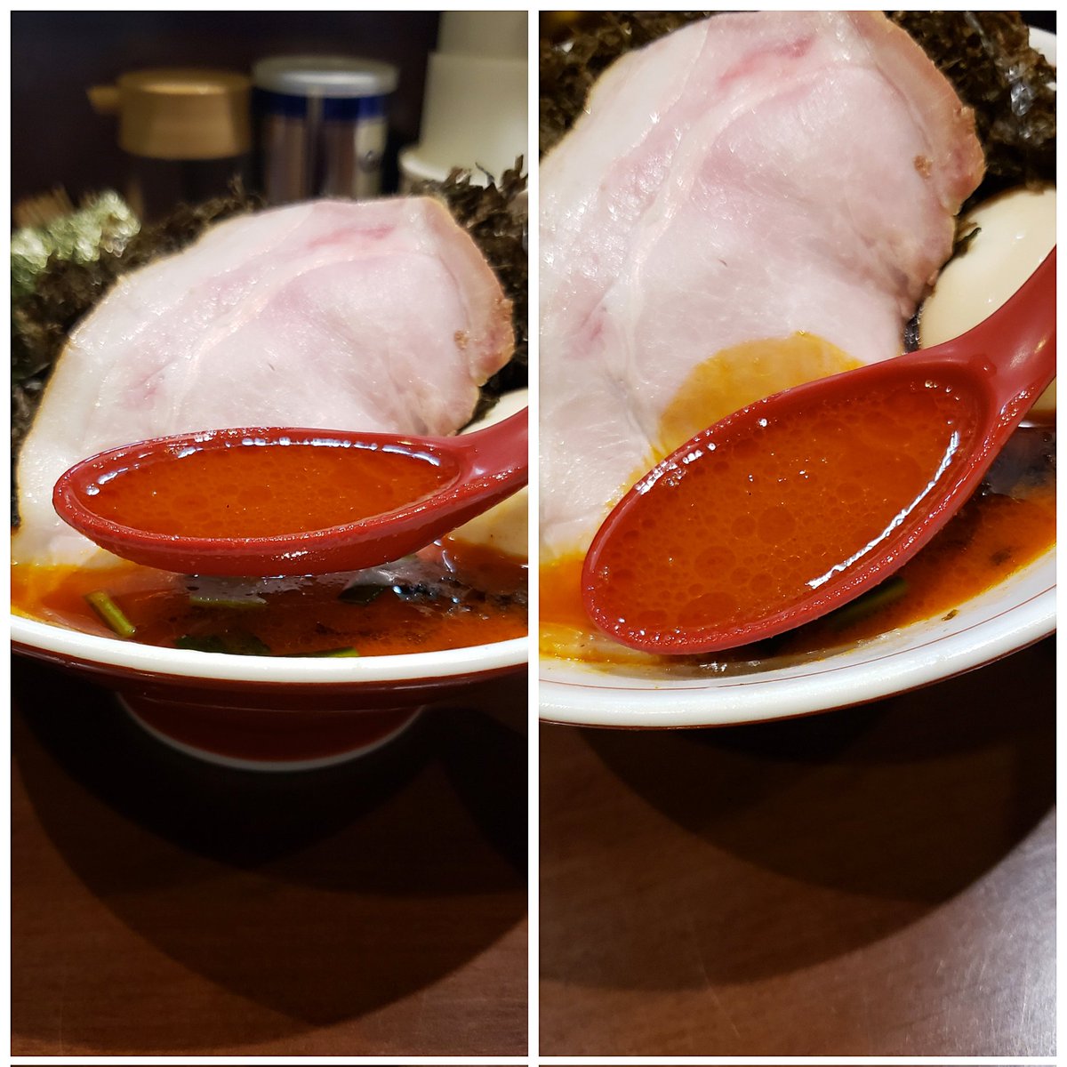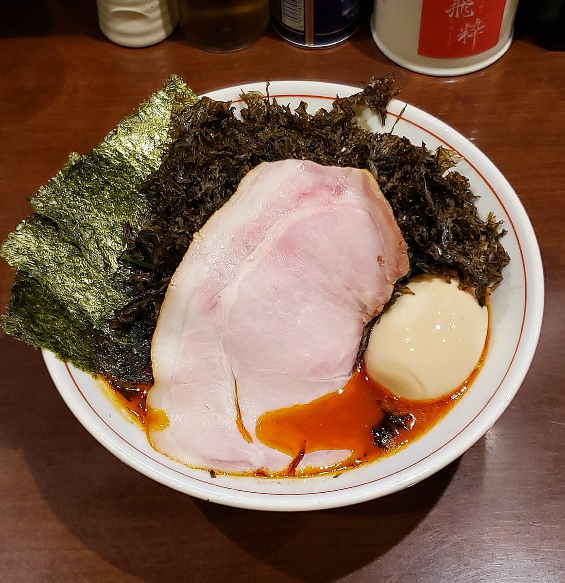 【らーめん飛粋】蒲田 らーめん もも(硬め,多め)+からし変更+岩のり 訪麺🍜鮮明な紅色が艶やかな豚骨soup!濃密円やかな豚出汁に潤沢な鶏油…ほんのりピリ辛なコク深い味わいが怒涛の様に押し寄せる珠玉の逸杯♪めッちゃウマ──ッ! 大判の薫香もも🥩&磯の香り高い岩のりも相性抜群🤩 超絶美味‼️🙏💥💯