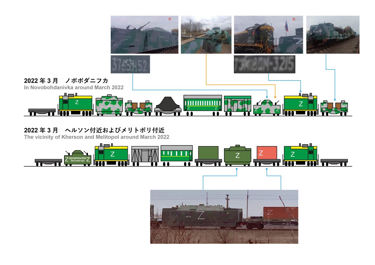 【装甲列車は2編成存在する】 ロシアによるウクライナへの「特別軍事作戦」開始以降、ウクライナではロシアの装甲列車が2編成確認されています。両列車はクリミア半島からウクライナ領域内に北上して侵入したとみられ、メリトポリやヘルソンの付近で確認されています。