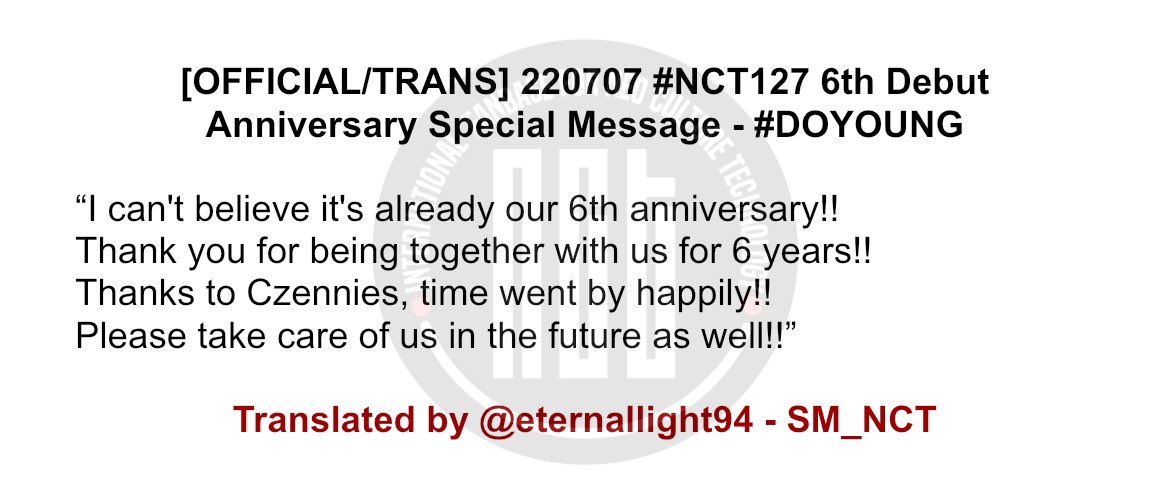 [OFFICIAL/TRANS] 220707 #NCT127 6th Debut Anniversary Special Message - #DOYOUNG