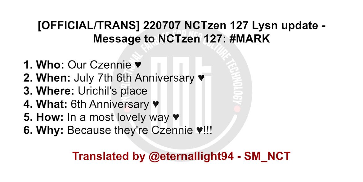 [OFFICIAL/TRANS] 220707 NCTzen 127 Lysn update - Message to NCTzen 127: #MARK