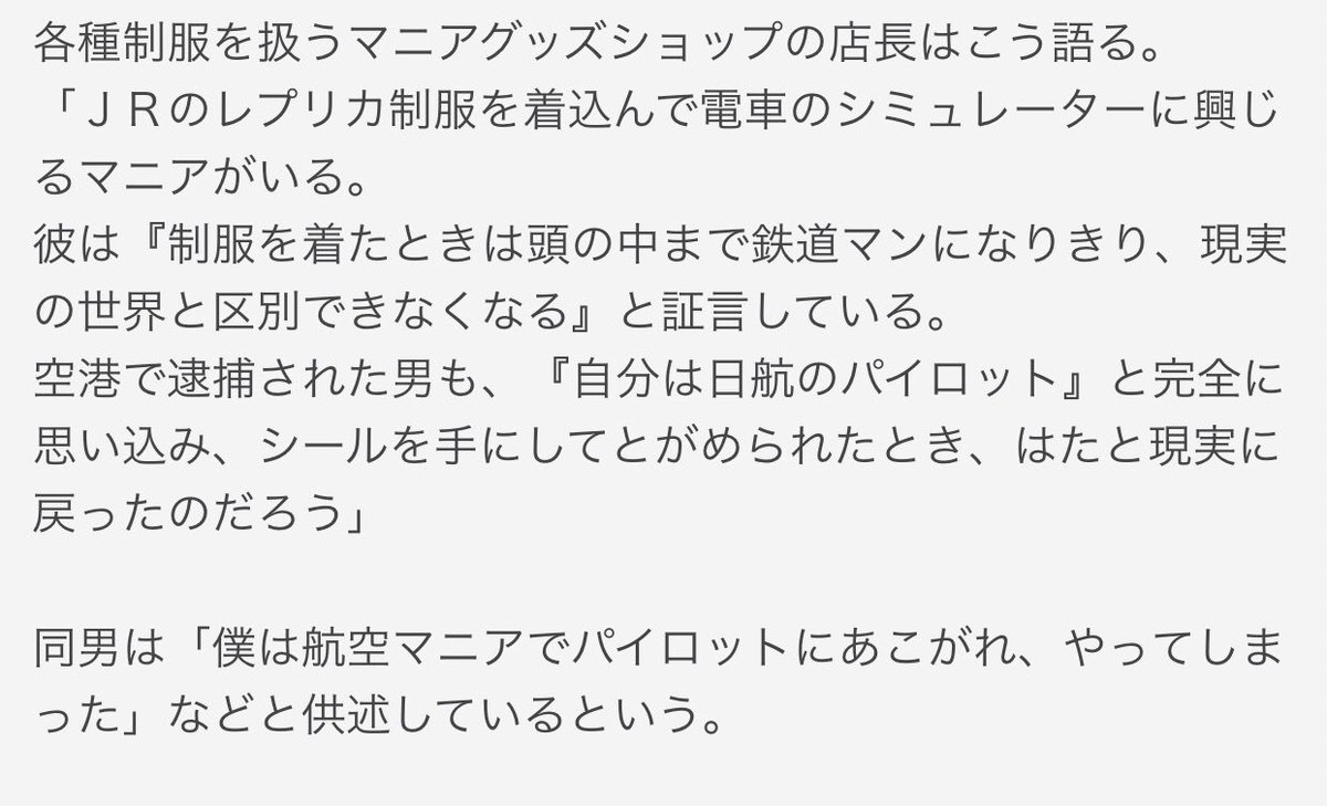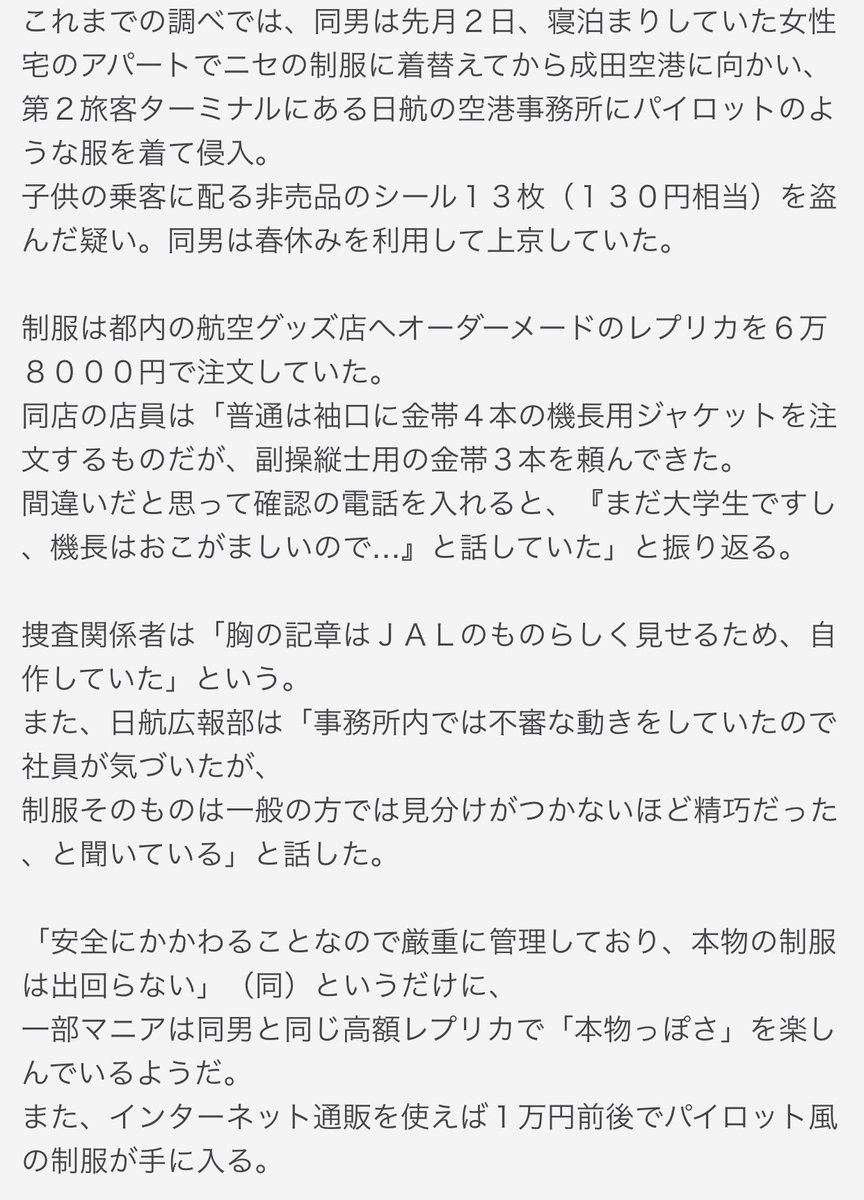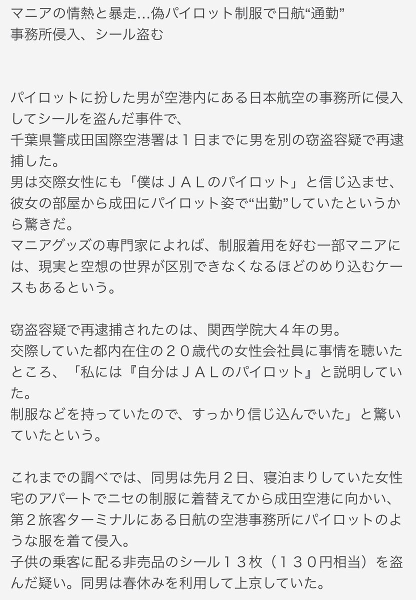 今から11年前、2008年に、パイロットの格好して航空会社の事務所に不法侵入し窃盗を繰り返し、知人女性に身分を偽って詐欺行為をした大学生が逮捕された事件を思い出した。極めて特殊な実例だろうけど、パイロットを演じ切って周囲に嘘を重ね続けていたのが凄い。もはや、コスプレの域を超えてる。