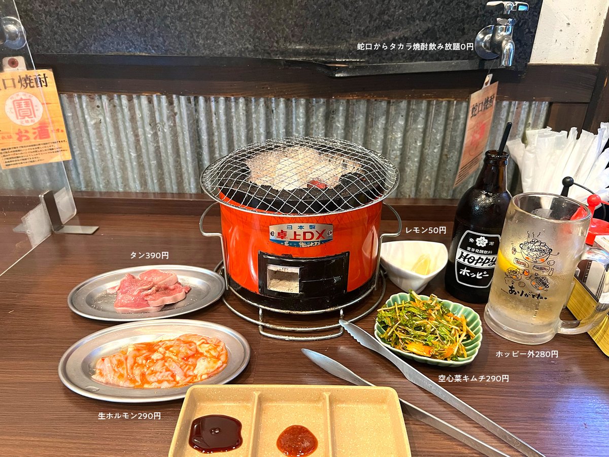卓上の蛇口からタカラ焼酎飲み放題がなんと0円。好きなだけ無料で注ぎ放題だなんて凄すぎる…!おまけに食肉卸直送のホルモンは290円からあり、鮮度よく美味しい。ホルモン&宝焼酎好きにおすすめ。