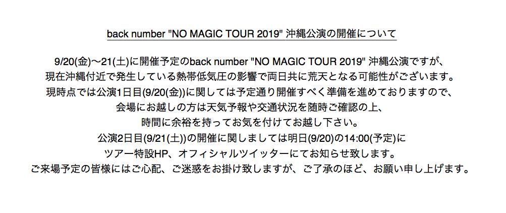 back number "NO MAGIC TOUR 2019" 沖縄公演の開催についてのお知らせです。