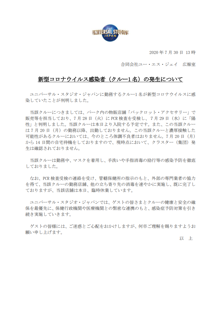 ユニバーサル・スタジオ・ジャパン 従業員1名が新型コロナウイルスに感染